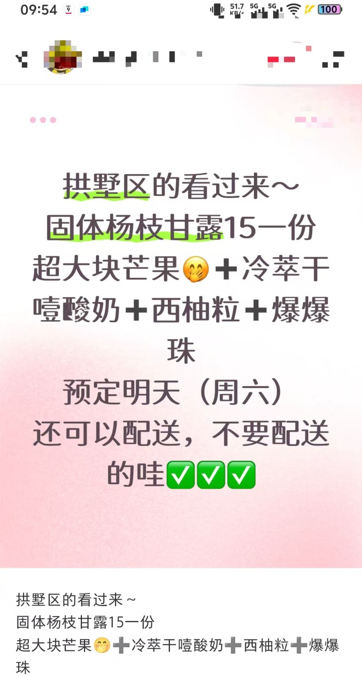 有网友购买了所需的原材料,自制固体版杨枝甘露,还有网友在朋友圈和社交平台上发帖售卖,称“每天数量有限,需要提前预订。”