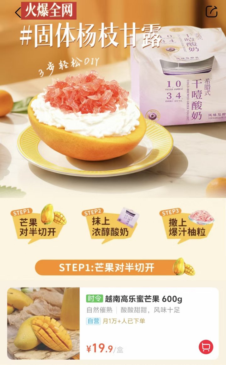 还有线上的叮咚买菜和盒马鲜生,也“快速跟风”,在部分地区推出了固体版杨枝甘露套装,在没有推出该产品的区域,搜索后则会显示固体版杨枝甘露所用的材料和制作方法。