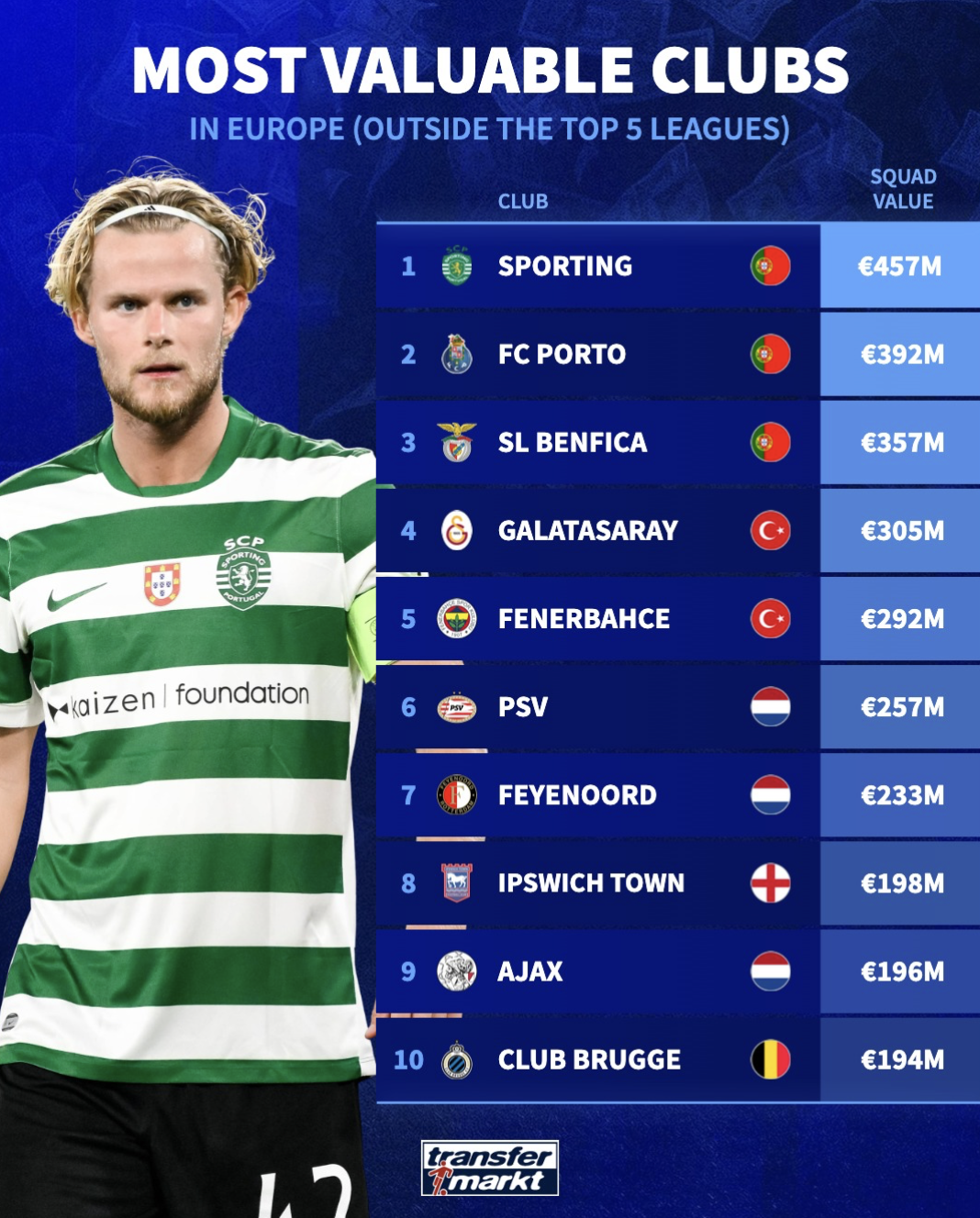 虎扑11月11日讯德转统计了五大联赛以外身价最高的欧洲球队排行榜。