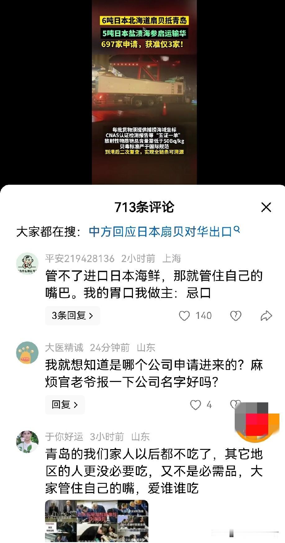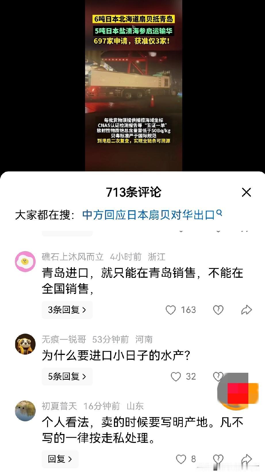 青岛真是敢为天下“鲜”。 日本北海道的6吨扇贝顺利在青岛通关! 还有5吨海参也在运输途中。 在青岛,啤酒和海鲜,是小到百姓日常饮食,大到招待宴请的标配。 胶州湾的生产的海鲜,更是以它的鲜美的出名,特别是胶州湾带鱼,简直就是有价无市的存在,并且价格要比体型比它大数倍的舟山带鱼贵上好几倍,还是无法阻挡人们对他的热爱。 随着近年来,渔业资源的匮乏,和大型捕捞船的加入,渔民们每次出海的收获,已远远无法满足市场需求了。 这也就带动了周边海域的加入,比如连云港的梭子蟹,就因为他们上市比胶州湾的早,并且价格便宜,而占有一席之地。 而这次6吨扇贝看着很多,其实一点都不多,并且也只是他们的前锋而已,相信市场打开了以后,肯定会大批量的倾销进来,冲击本地海鲜市场。 甚至会以青岛为跳板,销售到全国各地。这也是完全有可能的,毕竟他们的海鲜,在近几年,特别是福岛核废水排放以后,已经很少有人购买链接,各个海洋牧场一定积累了大量的海产品,如果他们想在短时间内解决,低价优质,肯定是他们的首选。 就是不知道这些产品会不会有溯源码,销售的时候会不会标注产地。其实有没有都一样,去饭店吃饭,总不能要求饭店每次给你亮码吧? 还有就是青岛到处都是海鲜市场,大小商贩去雨后春笋,总有人会“不小心”把溯源码弄丢了,普通人,特别是一些老人,又如何去区分哪些是洋海鲜呢? 商人逐利,劣币驱逐良币,是市场经济亘古不变的道理。 最后弱弱的问一句,那些进口北海道扇贝的人和负责国内销售的人,他们的餐桌上,会不会出现这些进口海鲜呢?