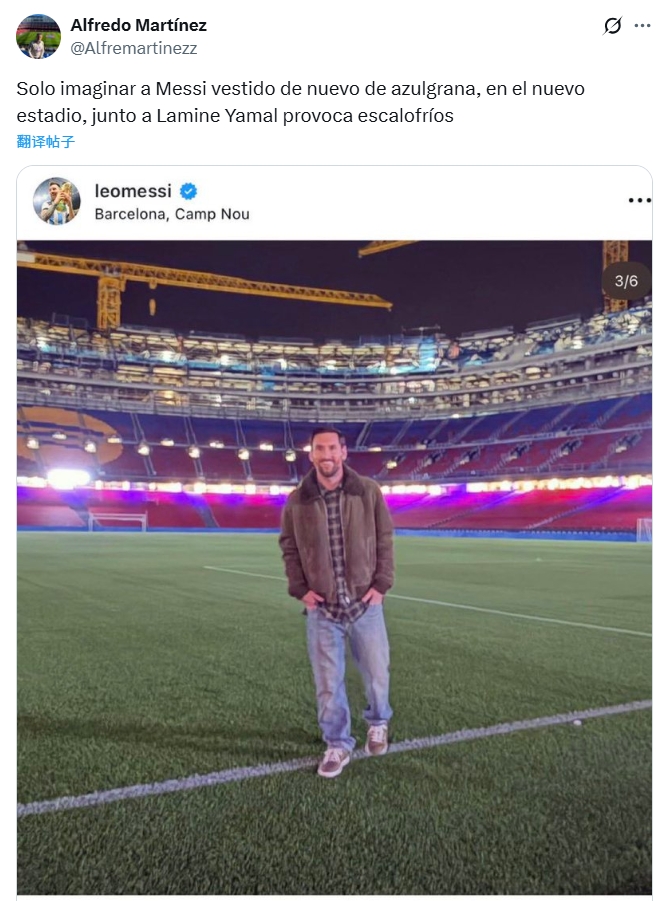 记者AlfredoMartínez表示:光是想象梅西再次身披红蓝战袍,在新球场与拉明·亚马尔并肩作战的画面,就足以让人激动战栗。