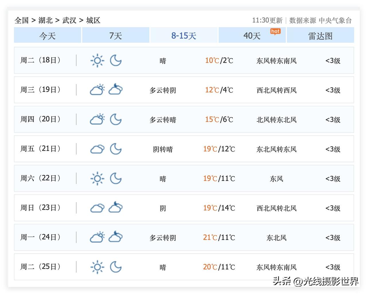 重庆人快来围观湖北武汉的天气预报!11月11日到25日,武汉市,几乎每天都是晴天,多云,晴好,是绝对主旋律,一个下雨天的天气预报都没有啊!湖北省,武汉市,怎么这么多阳光啊?!请问,武汉的太阳能光伏发电站,普及到每个国有企事业单位了吗?!普及到公共建筑,比如说 每一个商场购物中心的楼顶了吗?! 湖北武汉,看样子,特别适合普及太阳能发电啊! 重庆,只有用1块钱1度电的单位,才有动力安装太阳能啊!啊啊啊!