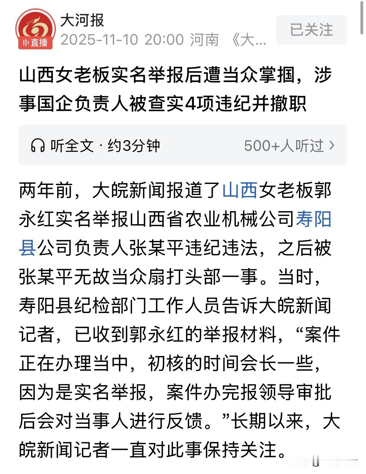 山西晋中,女老板看不惯一企业负责人拿着公款四处吃喝玩乐,生活奢靡,甚至在酒驾出事后找人顶包,她直接实名举报了,没想到,在那之后2人参加了同一场婚礼,对方看到女老板后,当众扬起手冲她后脑勺扇打了一巴掌,女老板知道对方是在报仇,也不示弱,当即报警,事后,对方仅被罚款500,女老板不服,继续举报,结局亮了! 2023年7月3日晚上9点,一家酒店灯火通明。郭永红穿着一身连衣裙,刚参加完朋友女儿的婚礼,正站在电梯口等电梯。 这时,只听啪一声脆响,郭永红后脑勺猛地一疼,她愤怒地扭头一看,是一个“老熟人”当众下狠手打了一下她后脑勺。 这人是某农业机械公司的负责人,张某平。他脸上带着酒气,此刻正用通红的眼睛瞪着郭永红。 张某平含糊不清地说:老郭,这么多年不见,连个招呼都不打?说完手还在她头上拍了一下。 郭永红瞬间明白过来,这哪是打招呼,分明是故意找茬。 张某平为啥要这样做呢?原来啊,郭永红2年前曾向相关部门举报过他。 其中的举报内容就包括:张某平私自把国有资产送人情、酒驾撞车后找人顶包、办公室超标装修、整天出入高档场所花天酒地… 郭永红知道,她今天当众在电梯口挨的这巴掌,不过是对方的报仇罢了。 然而,郭永红也不是好欺负的,她直接报了警。 当晚的监控录像显示,张某平确实喝了酒。警方后来出具的行政处罚决定书写着:因两人之前有纠纷,郭永红当晚没和张某平打招呼,张某平借着酒劲在郭永红头部位置扇了一下。 最后,张某平被处以500元罚款。 郭永红并不接受这个说辞,她愤怒表示:我跟他能有什么纠纷?唯一的纠纷就是我把他举报了! 她怎么也想不通,自己作为举报人,反而被被举报人在大庭广众之下打了。 更让她寒心的是,事后张某平不但没道歉,反而到处说她是小题大做。 这场风波并没有随着500元的罚款而结束。郭永红坚持向相关部门反映情况,要求彻查张某平的问题。 2年后的2025年11月10日,她终于等到了处理结果。 一个是撤销张某平职务的政务处分决定,另一个是留党察看两年的党纪处分决定。 工作人员向记者表示,主要查实了四项问题,第一项是跟着房地产商去河南云台山公款旅游,第二项是拿公款买高档香烟,第三项是几乎每天中午晚上都去KTV喝酒,第四项就是当众殴打举报人。 工作人员特别强调,处理结果早已当面告知郭永红本人。 有人说,可怕的不是被当众掌掴,也不是纷争,而是举报人的信息怎么会被被举报人知晓?这才是最可怕的,保密条例难道形同虚设? 光天化日之下,在婚宴人员聚集众多的情况下,恶意报复殴打举报人,性质极其恶劣,社会影响极坏,社会危害性极大,并已涉嫌污辱他人犯罪了吧? 实名举报人是相信法律,可往往是没有结果或避重就轻敷衍了事,最可怕的是举报人被打击报复,最佳选择是含冤受屈,保持沉默吧! 女老板敢于实名举报公职人员,说明她内心强大且坦荡,也反衬出打人者做贼心虚蛮横无理,应该关几天才好。 也有人说了,现在敢实名举报的都是破釜沉舟的人才敢举报,一般不是奔着鱼死网破的人就不要举报了,否则被举报的人分分钟就能找到你。 这一事件值得相关部门深刻反思,为什么举报人的信息会被当事人知道?如何保护举报人的合法权益才是问题的关键!否则,任意泄露举报人的信息,无疑将举报人的人身安全置于危险之中,让举报人情何以堪? 那么,从法律角度,怎么看待这件事? 《治安管理处罚法》第43条规定:殴打他人的,或者故意伤害他人身体的,处五日以上十日以下拘留,并处二百元以上五百元以下罚款;情节较轻的,处五日以下拘留或者五百元以下罚款。 张某平对郭永红实施扇打行为,符合“殴打他人”的构成要件。警方依据“情节较轻”情形作出500元罚款的行政处罚,符合法条设定的处罚梯度。 根据司法实践,未造成明显伤情、双方无长期矛盾、行为人主动配合调查等情形可归为“情节较轻”。 本案中,张某平虽借酒劲动手,但没有造成郭永红明显身体伤害,且双方此前无直接冲突,所以警方适用“五百元以下罚款”符合该法条。 如果郭永红伤情达轻伤以上,则可能触发《刑法》第234条故意伤害罪,但本案未达到刑事立案标准,所以仅作治安处罚。 对于这件事,你怎么看? 欢迎关注@一案一论