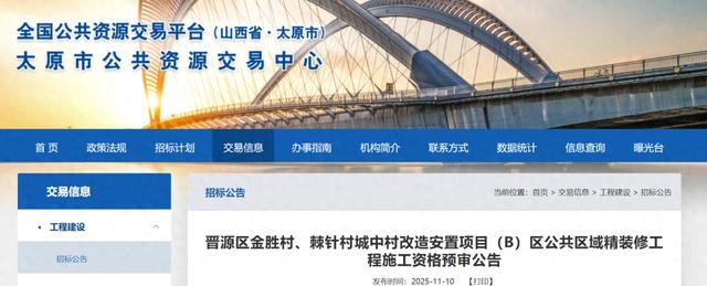 11月10日,太原市公共资源交易中心发布《晋源区金胜村、棘针村城中村改造安置项目(B)区公共区域精装修工程施工资格预审公告》。