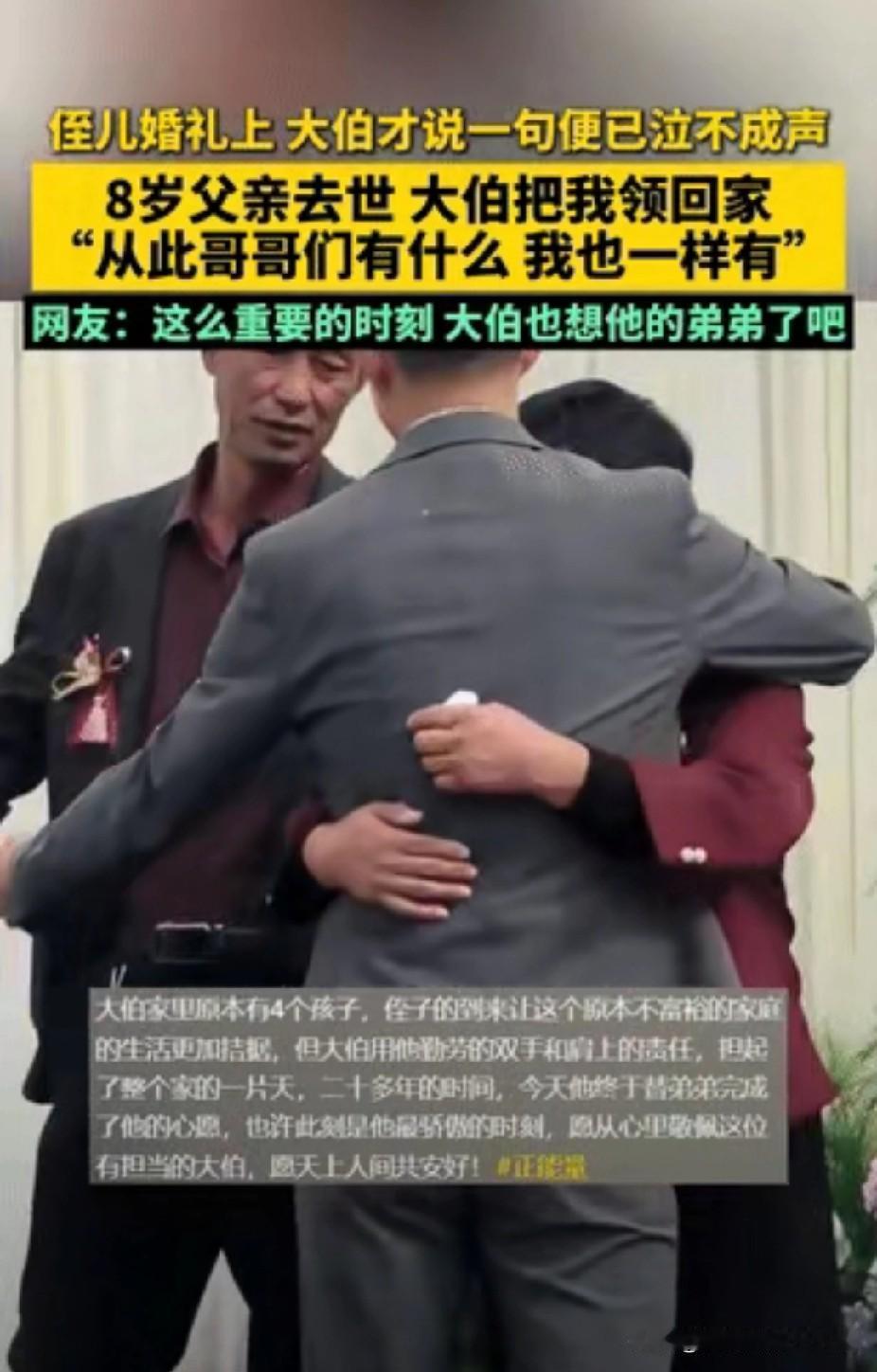 泪目了!山西,在一对新人的婚礼上,一大叔刚发表祝贺词就已经哽咽了。原来,这位大叔是新郎的大伯,新郎8岁父亲去世了,是大伯一手带大的,大叔哽咽的原因是终于帮弟弟完成了心愿!网友:“也许他也想起了自己的弟弟吧!” 大伯站在布置得喜庆温馨的婚礼舞台上,手里的话筒微微发颤。他望着眼前西装革履、英挺帅气的侄子,仿佛看到了多年前那个躲在自己身后、眼神怯生生的小男孩。台下宾客的喧闹声渐渐安静下来,所有人都注视着这位情绪激动的老人。“今天…今天是我侄儿的大喜之日…” 话才开头,他的声音就哽咽了,泪水在布满皱纹的脸上肆意流淌。他努力想继续说下去,却只是抬起粗糙的手掌,抹了抹眼角。 二十年的光阴在这一刻倒流。新郎刚满八岁那年,一场意外夺走了他父亲的生命。母亲受不了打击,一年后改嫁他乡,留下这个懵懂无知的孩子。家族会议上,亲戚们面面相觑,是大伯站了出来,声音不大却异常坚定:“我弟弟的血脉,我来养。” 那时大伯刚过四十,是个沉默寡言的农民,家境并不宽裕。村里有人劝他:“你自己还有一大家子要养活,何必再添一张嘴?” 大伯只是摇摇头:“他是我亲弟弟的孩子,我不能让他流落在外。” 最初的日子并不容易。侄子整夜哭喊着要爸爸,大伯就抱着他在院子里来回踱步,指着天上的星星说:“爸爸变成了最亮的那一颗,一直在看着你呢。” 他既当爹又当妈,白天在田里劳累一天,晚上还要帮孩子辅导功课。记得侄子初中时叛逆,逃学去打游戏,大伯找遍了镇上所有的网吧,找到后却没有打骂,只是红着眼睛说:“你要是学不好,我以后怎么跟你爸交代?” 那句话像一记重锤,敲醒了迷途的少年。 为了给侄子提供更好的教育,大伯农闲时就去工地搬砖、到县城打零工。皮肤被晒得黝黑,双手磨出厚厚的老茧,却从未有过一句怨言。几年前,侄子考上大学,那是村里少有的喜事。大伯把积攒多年的存折全部取出来,豪气地说:“去,好好读书,钱的事情你不用操心。” 其实那笔钱是他原本打算翻修老房子的。 婚礼上,新郎看着大伯哽咽的样子,自己也忍不住红了眼眶。他大步走上台,紧紧拥抱了这个比自己矮半头的老人。“没有大伯,就没有我的今天。” 新郎的声音有些发抖,“他不仅把我养大,还教会我如何做一个负责任的人。” 新娘也走过来,眼含热泪向大伯深深鞠躬。台下,不少宾客已经悄悄抹起了眼泪,尤其是那些了解这个家庭二十年艰辛历程的乡亲们。 这份兄弟情的延续,超越了生与死的界限。大伯在那个重要的日子里,不仅是作为长辈出席,更是代替他已故的弟弟完成了为儿子娶妻成家的心愿。他那声哽咽,包含着对弟弟的承诺与思念,也满溢着将侄子养育成人的欣慰与不舍。这种超越直系亲情的担当,在中国传统家庭中并不罕见,却每每令人动容。 血缘亲情有着神奇的韧性,它能让爱超越生死,让责任跨越代际。大伯用二十年的坚守,诠释了“长兄如父”的深刻内涵。这份情感不因兄弟的离世而消散,反而在岁月的淬炼下愈发坚韧。 各位读者你们怎么看?欢迎在评论区讨论。