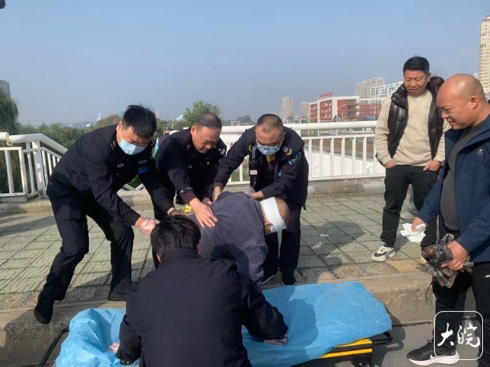 大皖新闻讯11月10日10时许,在阜阳市泉河桥中段,一名老人行走时突然身体发软,不慎摔倒在地,头部磕在桥梁栏杆处受伤并伴随大量出血。这一幕被路过的阜阳市公安局交管支队颍泉大队民警发现,民警和路过市民立即上前救助。