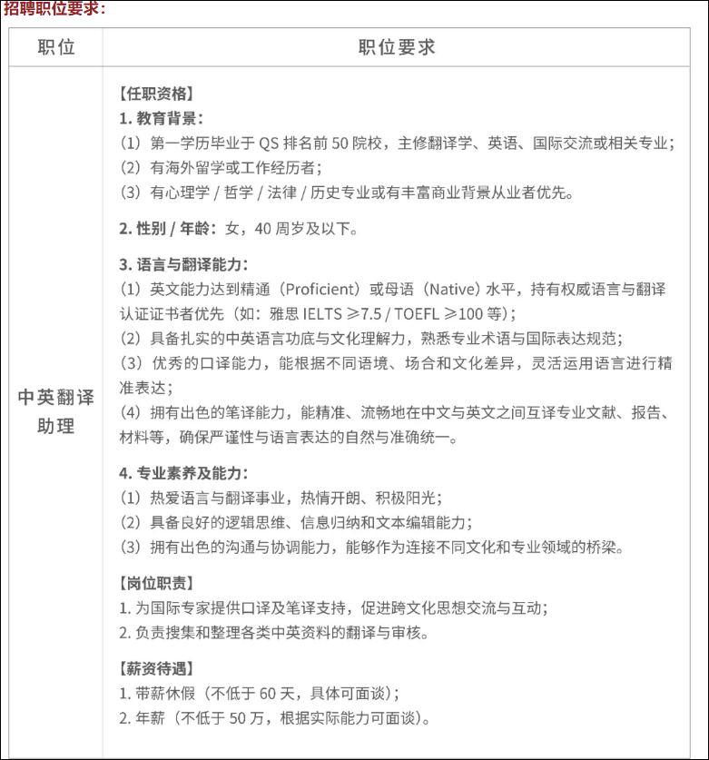 教育背景要求第一学历毕业于QS排名前50院校,主修翻译学、英语、国际交流或相关专业;有海外留学或工作经历者;有心理学/哲学/法律/历史专业或有丰富商业背景从业者优先。