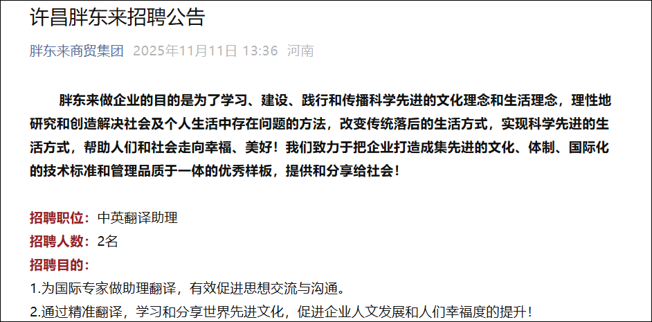 11月11日,胖东来商贸集团发布公告,将招聘2名中英翻译助理。其中任职资格要求,限制40周岁及以下女性。