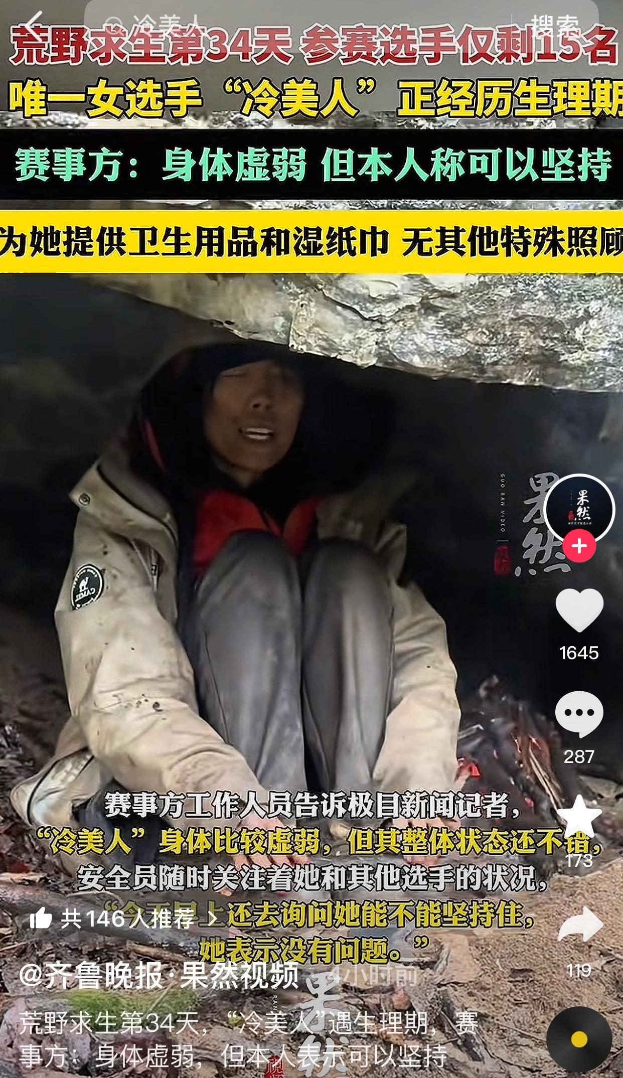 不出意外的话,“冷美人”将爆冷,获得荒野求生的冠军[捂脸] 目前,所有参赛选手中,“冷美人”的呼声越来越高涨,她从参赛开始到现在第34天的变化都被许多网友所关注。她的那一句“越是绝境,姐越冷静”为她赢得了很多网友的喜欢。 34天,“冷美人”已经熬走了85位参赛选手[呲牙]现在她的状态目前比之前弱,又正经历生理期,身体虚弱很多,但是她表示还可以继续坚持。 据了解,“冷美人”今天通过了体检,身体状态良好。节目为她准备的卫生用品和湿纸巾均被她拒绝了。 “冷美人”最终能否获得冠军,大家拭目以待!不管结局如何,她已获得6000元奖励,也已经出圈,成为一名网红[赞]