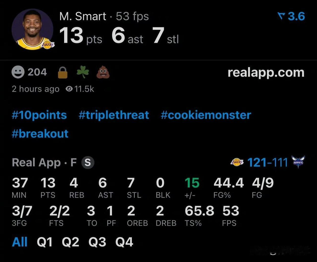 多少?7个抢断!我的天啊! 今天,客场作战的湖人队以121-111战胜黄蜂队,拒绝连败。本场比赛,两大核心东契奇、里弗斯无疑是场上的焦点,八村塁第三节也迎来爆发,但斯玛特才是真正的幕后功臣,他全场得到13分4篮板6助攻,还有恐怖的7个抢断! 湖人队在第三节能够拉开比分,正是因为斯玛特不要命的抢断,给球队争取到了更多的进攻机会,积极的拼抢也感染了队友,全队斗志昂扬,气势如虹!