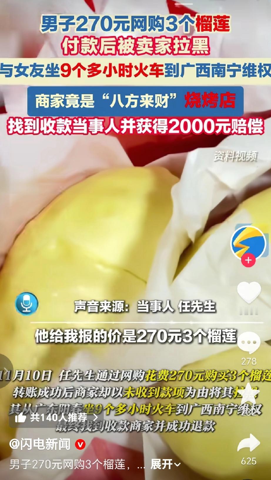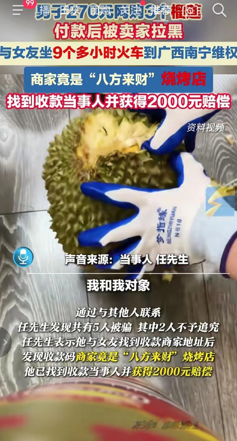 11月10日,任先生花费270元网购3个榴莲,转账成功后被卖家拉黑。一气之下便和女友从广东阳春坐9个多小时火车到广西南宁维权,他们通过IP地址和商家名片的门牌号,发现收款商家竟是一家名为“八方来财”的烧烤店,最终找到收款当事人,获得包含270元货款在内的2000元赔偿。要是不来找,这270元的货款很可能就打水漂了,而且卖家的这种欺诈行为也会继续坑害其他消费者。(来源于@闪电新闻) ​