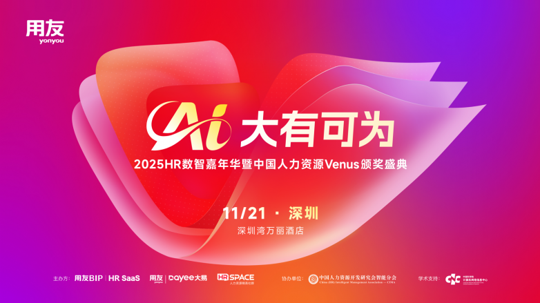 2025年11月21日,“AI大有可为”2025HR数智嘉年华暨中国人力资源Venus颁奖盛典将在深圳湾万丽酒店盛大启幕!本次盛会由用友HRSaaS、用友大易、HRSPACE联合主办,中国人力资源开发研究会智能分会协办,诚挚邀请全国HR从业者、企业管理者与行业专家齐聚一堂,共同探索AI时代人力资源管理的创新路径。在这里,与会者既能发现“技术在HR领域的大有可为”,解锁数智化转型的实战方法;也能与1000+行业同行深度交流碰撞,在思想互动中为自身成长注入新的动能。