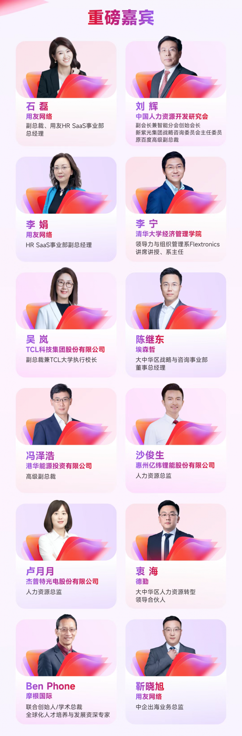 清华大学经济管理学院教授李宁、中国人力资源开发研究会副理事长刘辉、TCL科技集团副总裁吴岚等学界、业界领袖将齐聚现场,围绕“AI撬动组织管理变革”“全球化人才管理”“HR数智化最佳实践”等热点议题展开深度分享,为参会者带来最前沿的行业洞见与实战经验。