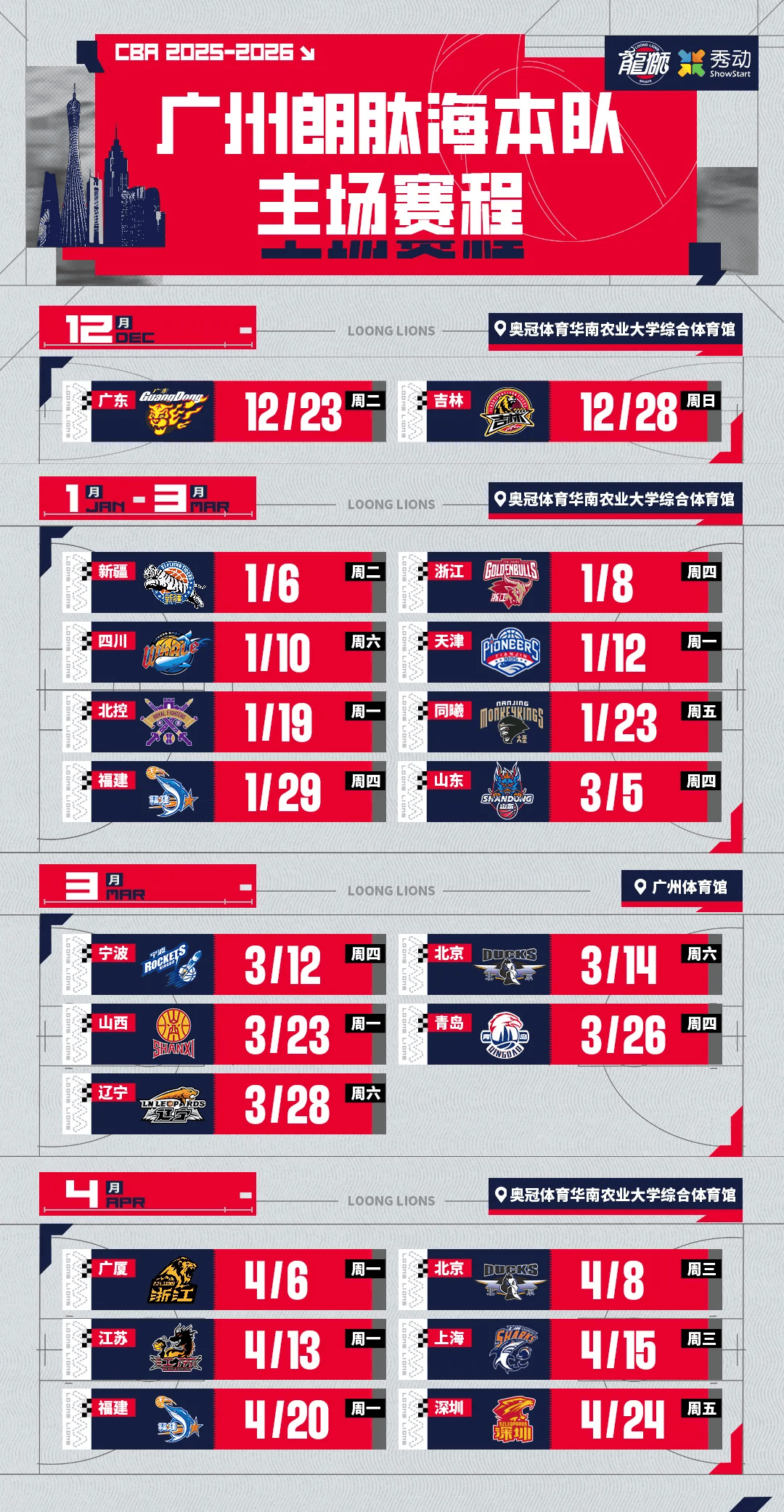 虎扑11月11日讯今日,广州男篮官方发文,分享球队新赛季主场赛程表。