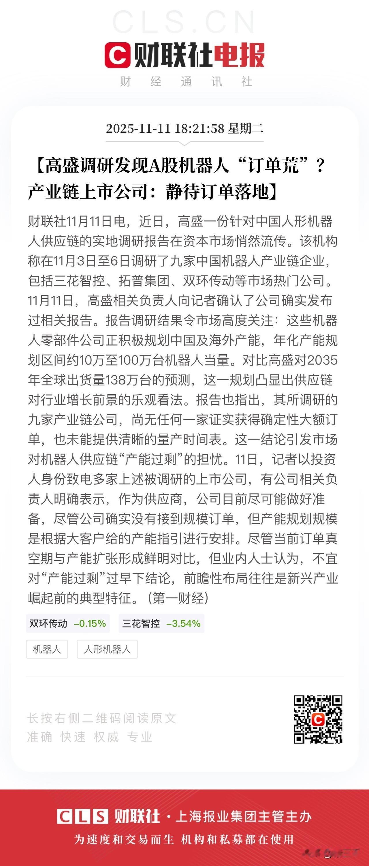 高盛调研机器人得出“订单慌”结论, 目前海内外产能规划10万-100万台, 高盛预计2035年出货量138万台! 市场认为这是机器人当下的窘境和现实, 因为关键技术没突破, 不能真正意义上的对人工实现替代, 所有行业都在观望! 而产业链玩家也在积极扩展, 比如动作要求低情绪价值高的Ai玩具、陪伴机器人、机器狗。 高盛这个预估对于中国市场比较保守, 因为一旦技术突破, 中国制造和服务业整个产业, 就能把需求拉到千万台级别… 这一点可以从禾赛科技激光雷达出货量验证!