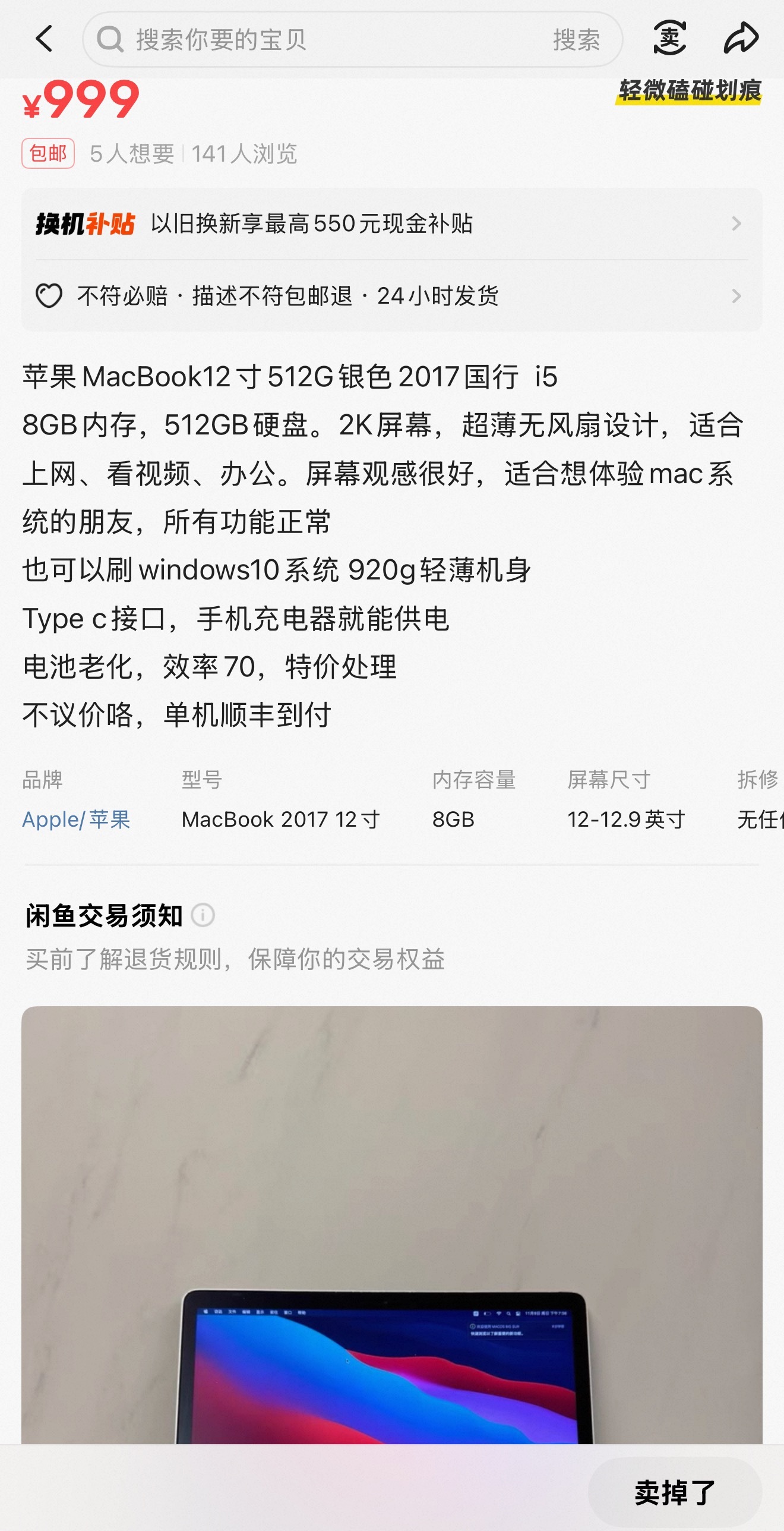 终于在闲鱼找到了2017款、银色、高配i5+512、成色完美的12寸MacBook,刀了100,900拿下。成色配色配置售价全部满足。到货后我会去换个电池,系统降到Catalina...这机器我只会在重装旅行、户外徒步高山等场景携带,轻便。最关键的是它很便宜,随便造不心疼