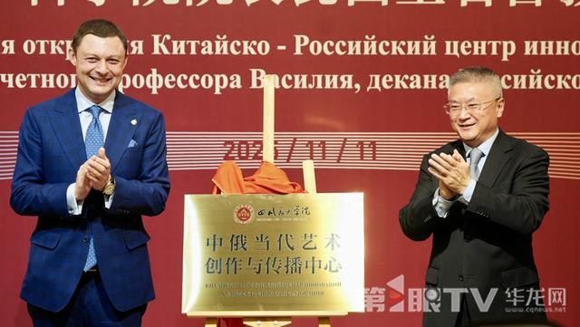 四川美术学院党委书记唐青阳和瓦西里·祖拉博维奇·采列捷利共同为“四川美术学院中俄当代艺术创作与传播中心”揭牌。第1眼TV-华龙网记者刘钊摄