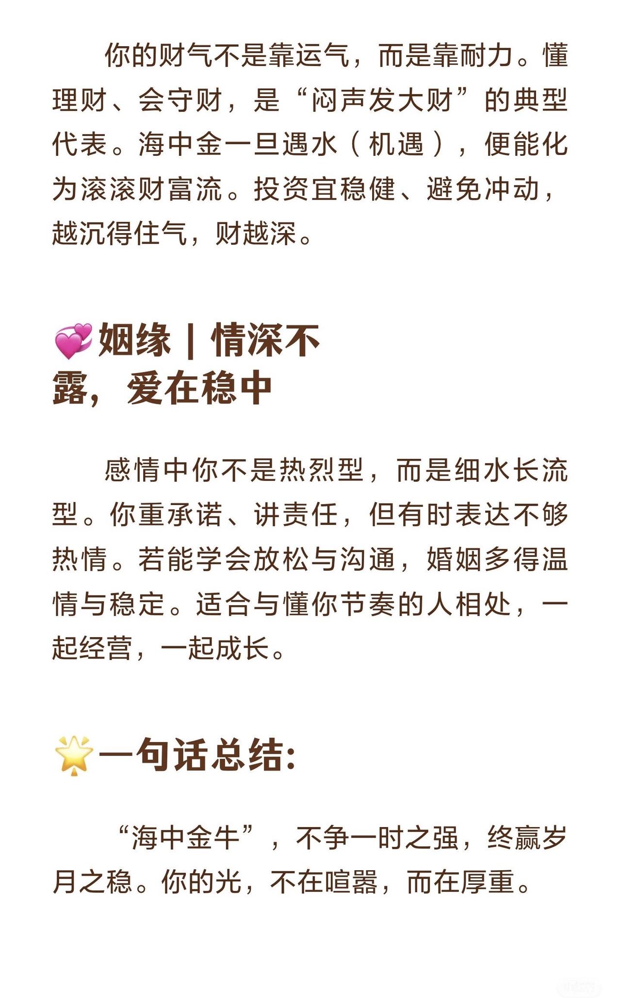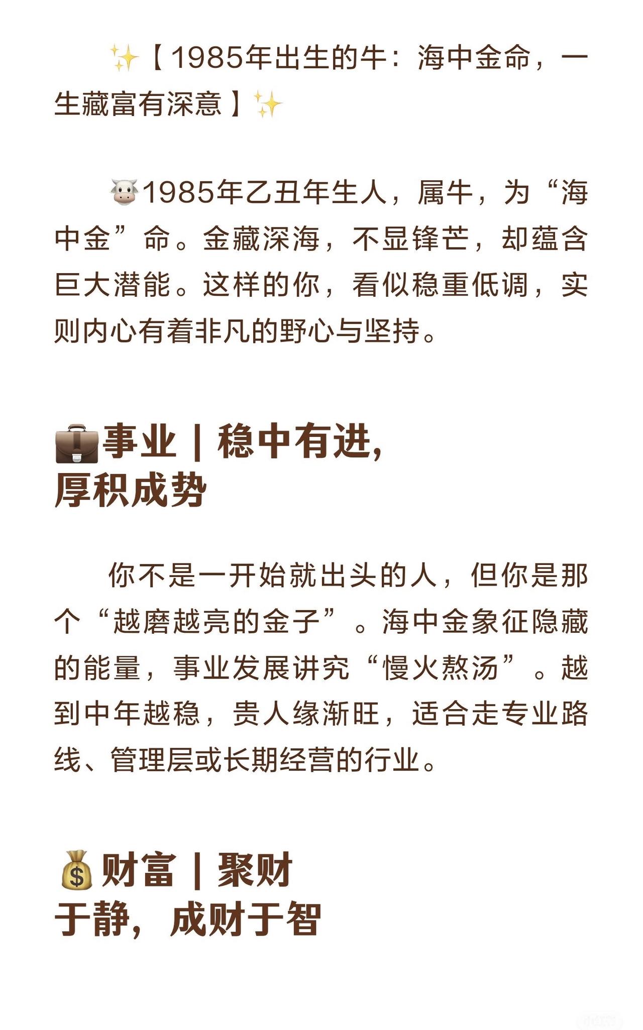 ✨【1985年出生的牛:海中金命,一生藏富有深意】✨ 🐮1985年乙丑年生人,属牛,为“海中金”命。金藏深海,不显锋芒,却蕴含巨大潜能。这样的你,看似稳重低调,实则内心有着非凡的野心与坚持。 💼事业|稳中有进,厚积成势 你不是一开始就出头的人,但你是那个“越磨越亮的金子”。海中金象征隐藏的能量,事业发展讲究“慢火熬汤”。越到中年越稳,贵人缘渐旺,适合走专业路线、管理层或长期经营的行业。 💰财富|聚财于静,成财于智 你的财气不是靠运气,而是靠耐力。懂理财、会守财,是“闷声发大财”的典型代表。海中金一旦遇水(机遇),便能化为滚滚财富流。投资宜稳健、避免冲动,越沉得住气,财越深。 💞姻缘|情深不露,爱在稳中 感情中你不是热烈型,而是细水长流型。你重承诺、讲责任,但有时表达不够热情。若能学会放松与沟通,婚姻多得温情与稳定。适合与懂你节奏的人相处,一起经营,一起成长。 🌟一句话总结: “海中金牛”,不争一时之强,终赢岁月之稳。你的光,不在喧嚣,而在厚重。 ——海中金命 1985属牛 事业财运姻缘分析