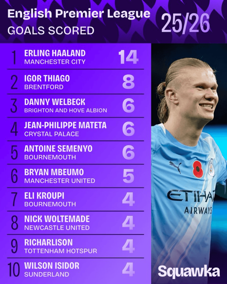1、埃尔林-哈兰德,曼城,14球
