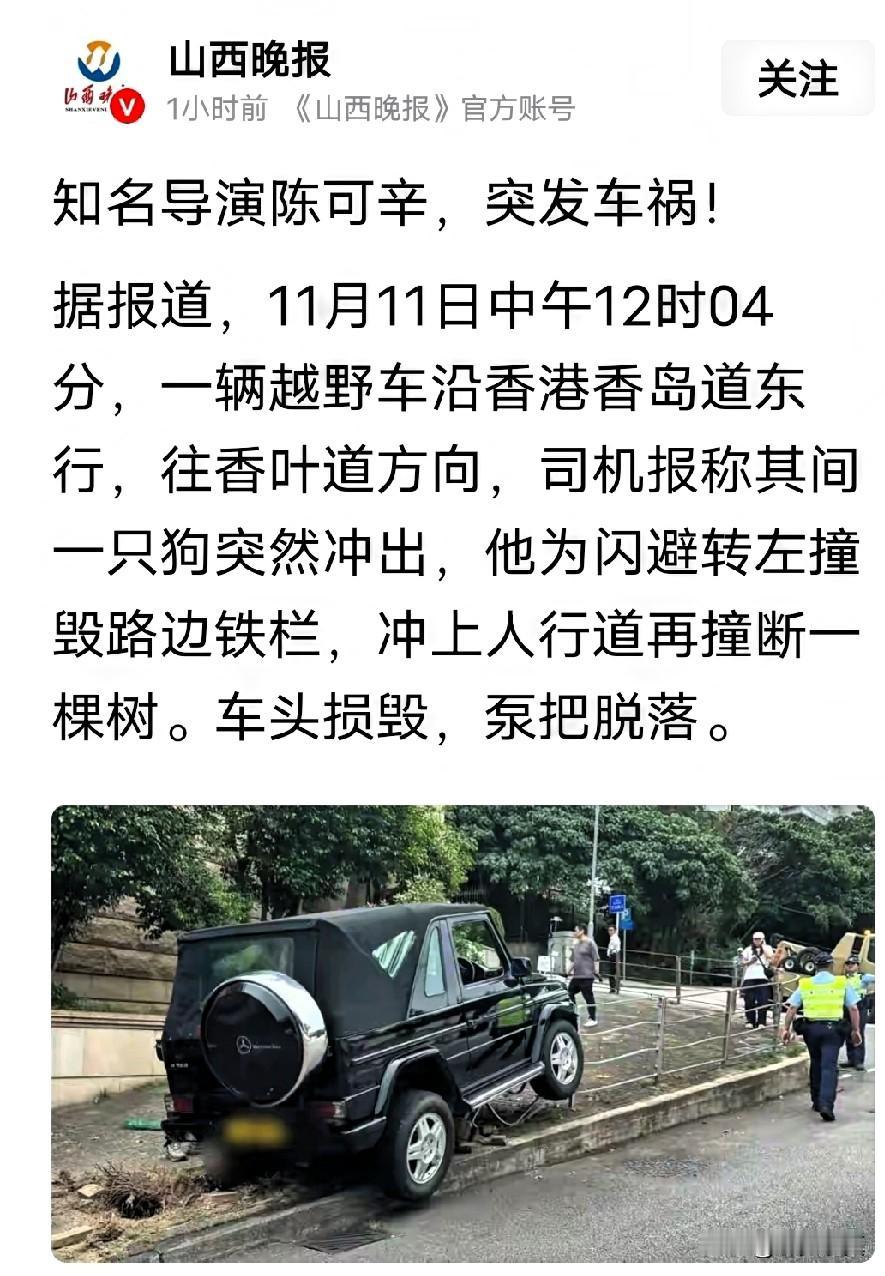 出大事了:著名导演陈可辛出重大车祸,越野车当场前脸报废 11月11日正午12时04分,香港香岛道东行路段突发惊险车祸,知名导演陈可辛驾驶的黑色奔驰越野车为避让突然冲出的流浪狗,失控撞毁护栏后冲上人行道,最终撞断一棵直径30厘米的棕榈树才停下,现场一片狼藉。 据现场画面显示,涉事车辆损毁严重,右车灯完全碎裂,前泵把脱落,引擎盖隆起变形,零件碎片散落路边;1.5米高的铸铁护栏被撞断一截,断裂的树干横卧人行道,可见撞击力度之大。万幸的是,62岁的陈可辛仅受惊吓,手腕轻微擦伤,下车时意识清醒,还第一时间确认流浪狗已安全跑开,随后冷静报警并联系助手善后。 警方到场后,陈可辛配合完成酒精测试及笔录,确认无酒驾、超速等违法行为,事故初步认定为突发避险导致。此事迅速冲上热搜第三,阅读量破2亿,3.8万条评论吵出三大焦点:“心疼派”网友庆幸其平安,盼新片《李娜》顺利推进;“探讨派”就“急转避让vs先刹减速”展开争论,还关注八万港币的护栏及树木赔偿归属;“提醒派”则分享行车经验,呼吁重视流浪动物管理问题。 陈可辛通过工作室回应,强调“安全第一,感谢无人伤亡”,并提醒驾驶者保持安全车速、集中注意力。目前涉事车辆已被拖离,警方正调取监控进一步调查,这场意外也再次为道路交通安全与动物保护议题敲响了警钟。