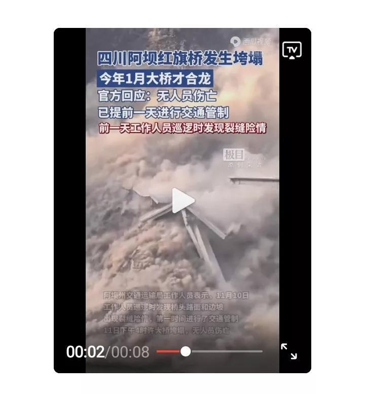 四川阿坝红旗特大桥发生垮塌 11月11日,四川阿坝州红旗特大桥突发垮塌事件。该桥今年1月主跨才刚合龙,事发前一天已提前实施交通管制,目前暂无人员伤亡报告。 视频画面显示,主桥已塌陷至足木足河中,激起巨大烟尘。 据马尔康市政府官员透露,目前伤亡情况尚不明确。