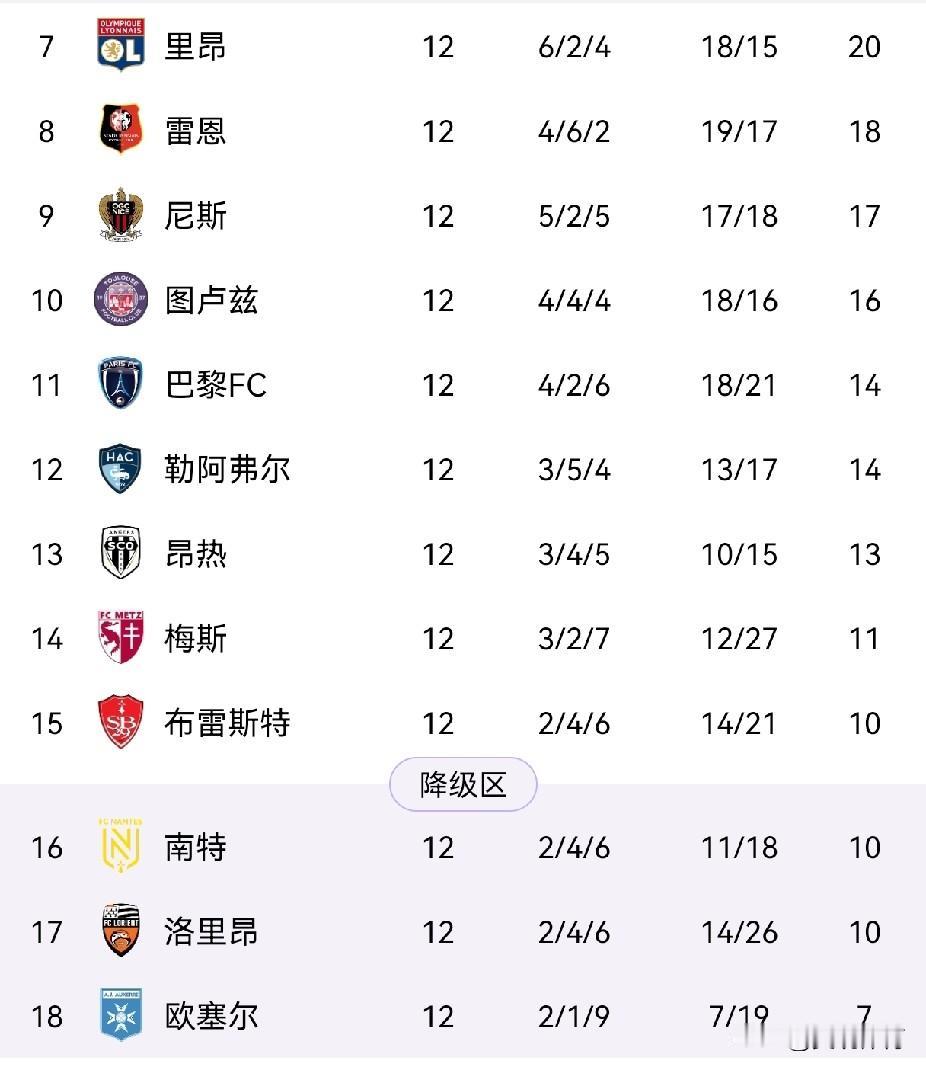2025~2026赛季法国足球甲级联赛积分榜(第12轮) 巴黎圣日耳曼(27分)、马赛(25分)、朗斯(25分)位居前三名。 法甲前三名获得参加欧冠正赛资格,第四名获得参加欧冠附加赛资格;第五名将获得欧协联正赛资格,第六名获得欧协联资格赛资格。