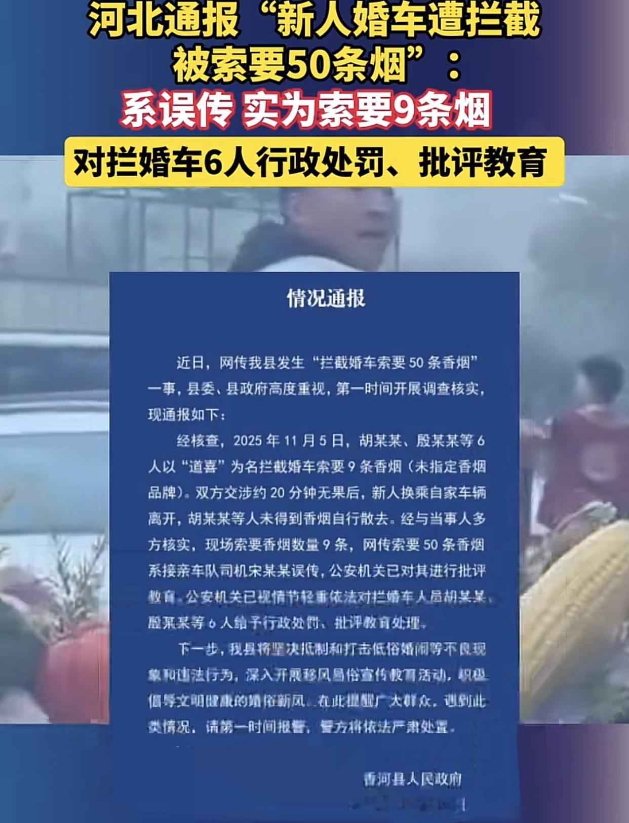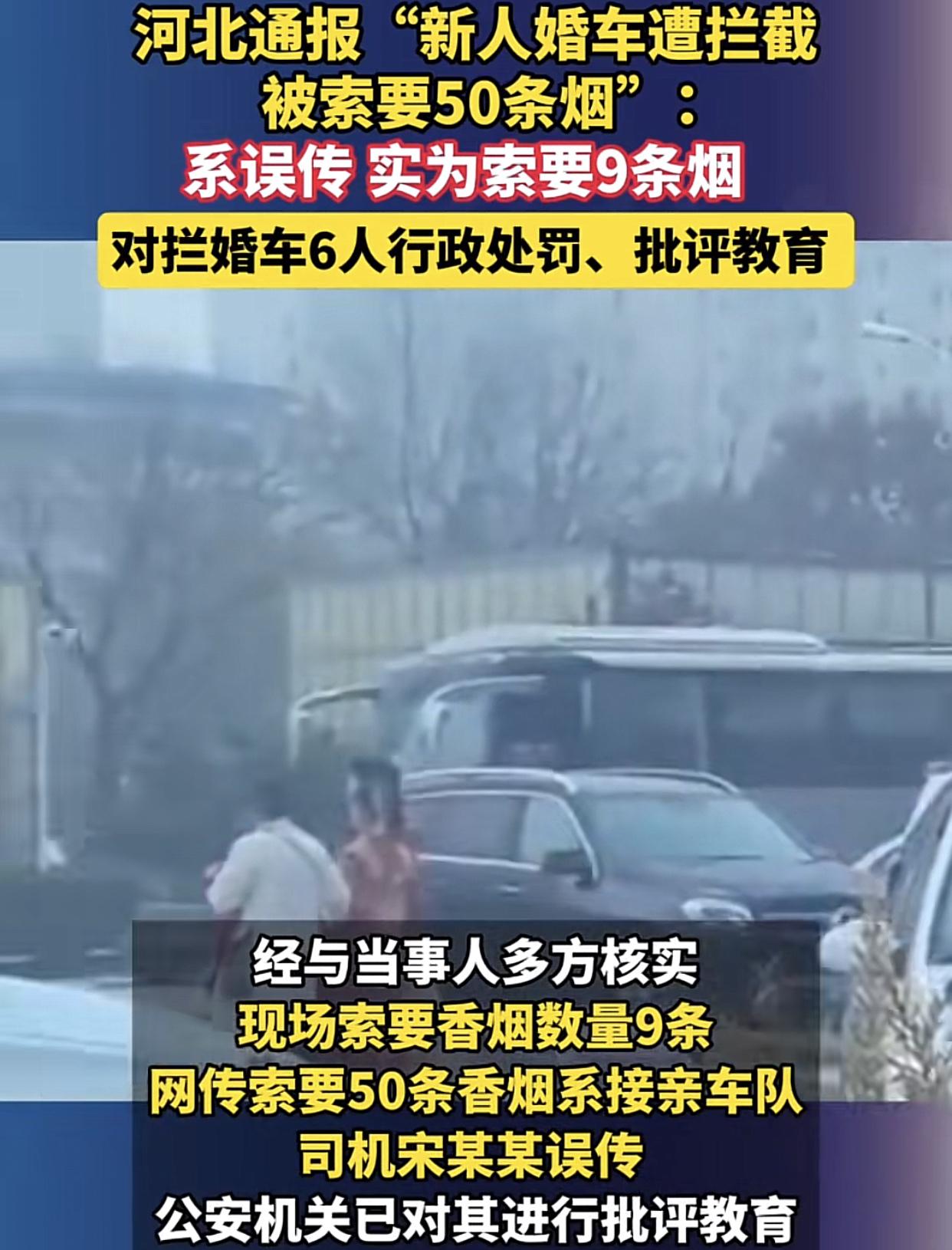 河北廊坊警方办事了, 网传香河6人在某酒店堵婚车向新人索要50条香烟,是误传,真实情况是要9条香烟!由此,香河警方已对6多当事人作出行政处罚,批评教育。 人家结婚本来就是开开心心的,喜烟一盒就行了,沾沾喜气,毕竟是民俗。拦车强行索取,把别人的结婚大喜日子当作敛财工具,性质就变了。 往重些说,这种人整天活不干,每天睁开眼,就想着哪哪有人办喜事去拦婚车,目的只有一个:就是想不劳而获,批评教育管的住吗?不管多少条都应严惩才能刹住这种陋习。