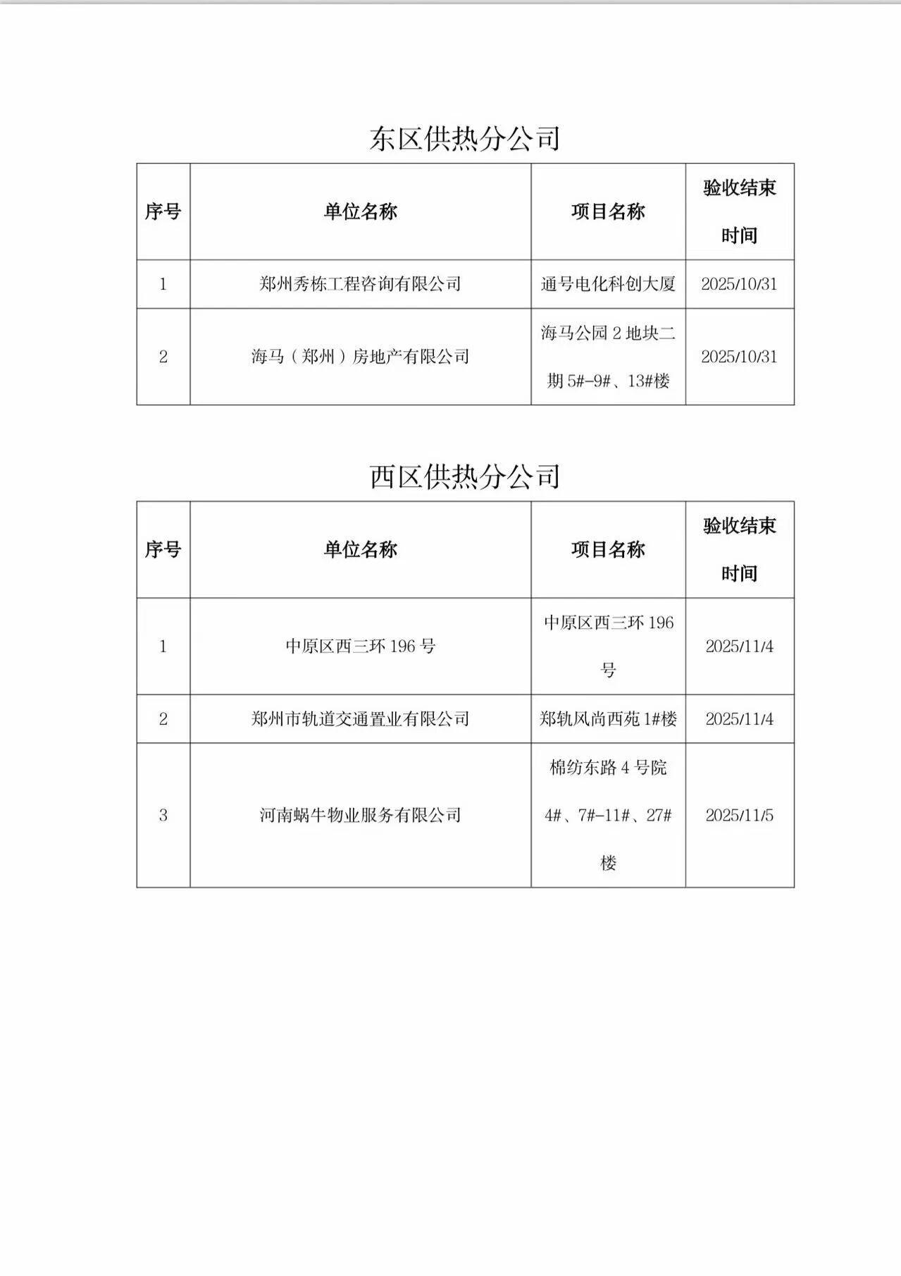 郑州供热最新消息! 管城发布 2025年11月11日 19:46 河南 6人 各报装用热单位:公司报装系统现有以下用热项目10个,报装用热建筑面积44.12万平方米,各项供热工程验收合格,符合供热技术规范和使用要求,现予公示(见附表)。根据《郑州市城市供热与用热管理办法》第二十一条的规定,“新增热用户应当在每年4月1日至6月30日期间与供热单位签订书面合同,并办理相关手续”的,本供热期予以供热。6月30日之后验收合格用户,我公司会根据项目所在区域热源调度情况,按用户工程验收合格先后时间排列推进。特此公告。附表:2025-2026供热期用户工程验收合格用户清单(四)郑州热力集团有限公司2025年11月11日