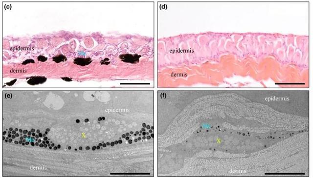 地表鱼类细尾高原鳅(左)和洞穴鱼类玫瑰高原鳅(右)皮肤的染色切片(c、d)和黑素细胞镜照片(e、f)(图片