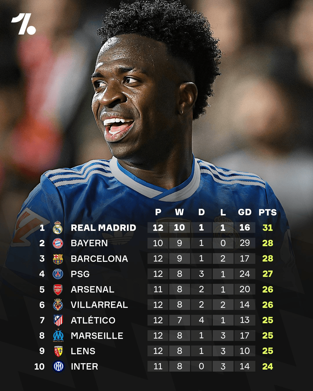 虎扑11月11日讯OneFootball统计了本赛季欧洲五大联赛的总积分榜,皇家马德里处在榜首位置: