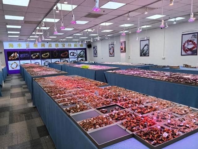 位于汕尾海丰的可塘珠宝交易市场,商铺林立,店内商品珠光熠熠,吸引不少顾客前来选购。