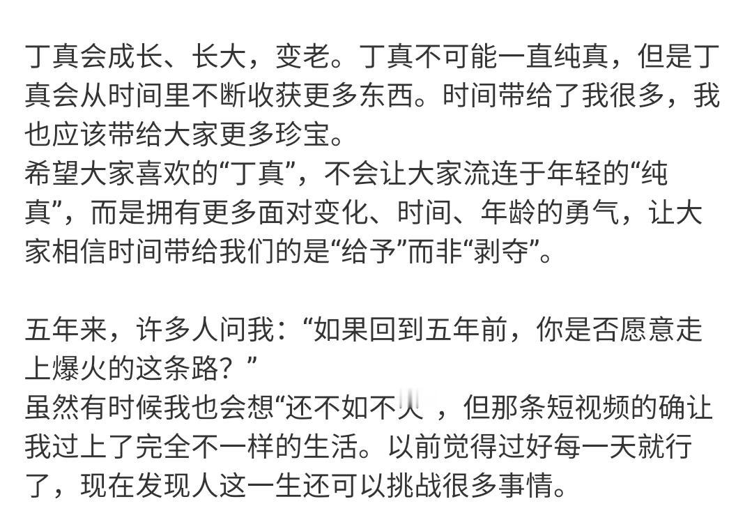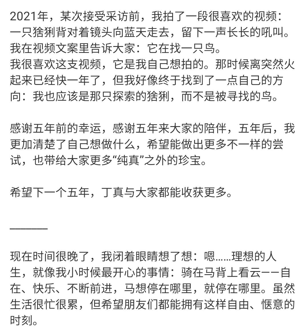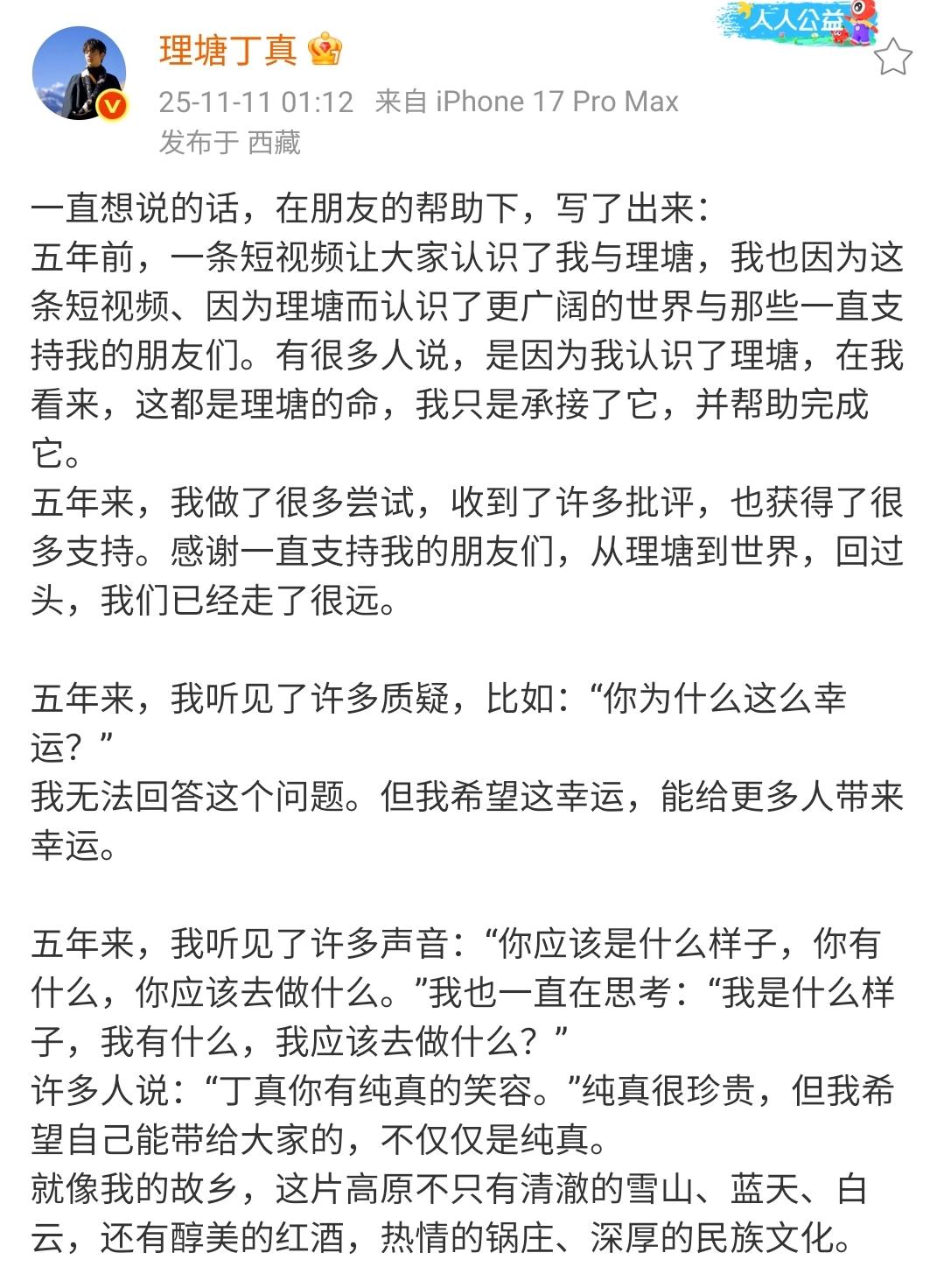 丁真出道五周年发长文,依旧真诚和淳朴。 最近恰好也在看他的综艺《寻真之地》,还是那么真诚,而且还更勇于表达自己的想法。丁真与邓亚萍,谭维维也能侃侃而谈,他变了,也没变,他依旧带着一颗真诚的心,在走属于自己的路。 希望他越来越好! 丁真