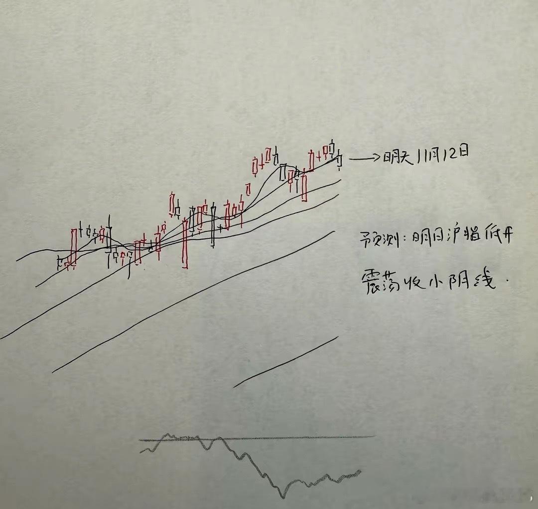 今天a股高开随后调整收在4000点上方,明天A股怎么走?到底是涨还是跌?莎莎做了一个大胆的预判,为什么要这么预判?大家听莎莎给大家讲三个具体理第一,上证指数今天的最高点到达4024点,本轮指数反弹的最高点4025点。今天指数到达4024点之后,就一路震荡下行下行,全天走势整体来说相对偏弱。并且,伴随着成交量萎缩。所以通过今天无法破前高以及成交量萎缩的情况来看,市场指数在这个位置,进入到箱体震荡的概率更大一些。箱体的低点在上周星期三的低点3922点附近。第二,从图一浪型结构上来看,上证指数目前已经完成了一个清晰的五浪结构。而且第5浪的时候已经出现了明显的衰竭楔形走势。并且伴随着macd指标顶背离, Rsi指标顶背离,以及成交量的顶背离。再加上整体五浪结构上涨的时间跨度,从3040点的最低点到本周为止,一共有33个交易周,33又是在典型的斐波纳契数字,34的旁边,在34前后产生变盘的可能性是非常大的。所以时间窗口上来看——本周也属于关键变盘周附近。第三,创业板指今天的跌幅达到了1.4%,深圳成指的跌幅达到了1.03%。创业板指,深圳成指今天都走出了明显的实体阴线,从图二创业板指的角度来分析。创业板指面临短线abc三浪结构的可能性。所以,综合以上分析,莎莎对于明天市场走势的判断,我个人认为明天上证指数小幅度收一颗阴线的概率相对较大。那么明天A股到底怎么走,大家请看图三关于明天走势莎莎手绘的预测图当然,以上观点仅仅代表莎莎个人对于市场的一些粗浅的见解,对于市场走势的分析多半从纯粹的技术面出发,对于消息面和基本面的分析则相对较少,我的观点不一定正确,仅代表个人见解,不代表任何投资建议。最后莎莎想要补充一点的是,对于市场走势的判断,其实难度是非常大的。大家应该明白,市场充满了各种各样的变量和随时可能会发生的不同的因素。所以对于市场走势的分析,难度真的非常的大。尤其是像莎莎这种将市场走势用白纸黑字的形式表达出来的,可以说更是难上加难。大家理解了这个难度之后,我相信大家就不会对我那么的苛责了。并且作为一个纯技术派的老手,我自认为对于市场的判断是没有问题的。 A股自8月25号以来开始的震荡区间,可以说一共有6次比较明显的波段调整,而这6次调整,莎莎也基本上都给大家把握到了。好了就先和大家说的这里,大家点赞,评论➕关注就是对莎莎这个纯技术派的最大支持。