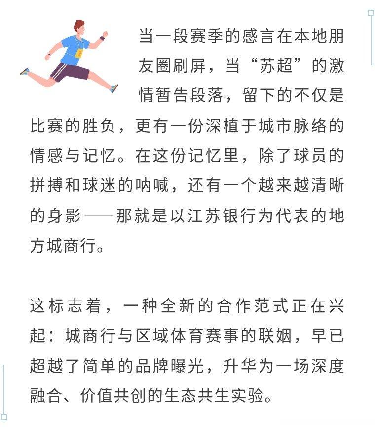 当城市的体育心跳与金融脉搏同频共振,当球场上的激情呐喊与柜台前的专业服务交融共鸣,城商行与“X超”的故事已超越商业合作范畴。南京的江苏银行深耕“苏超”多年,其品牌已与江苏足球文化深深交织;宁波银行通过为马拉松量身定制保险,将风险管理的专业形象植入市民心中。