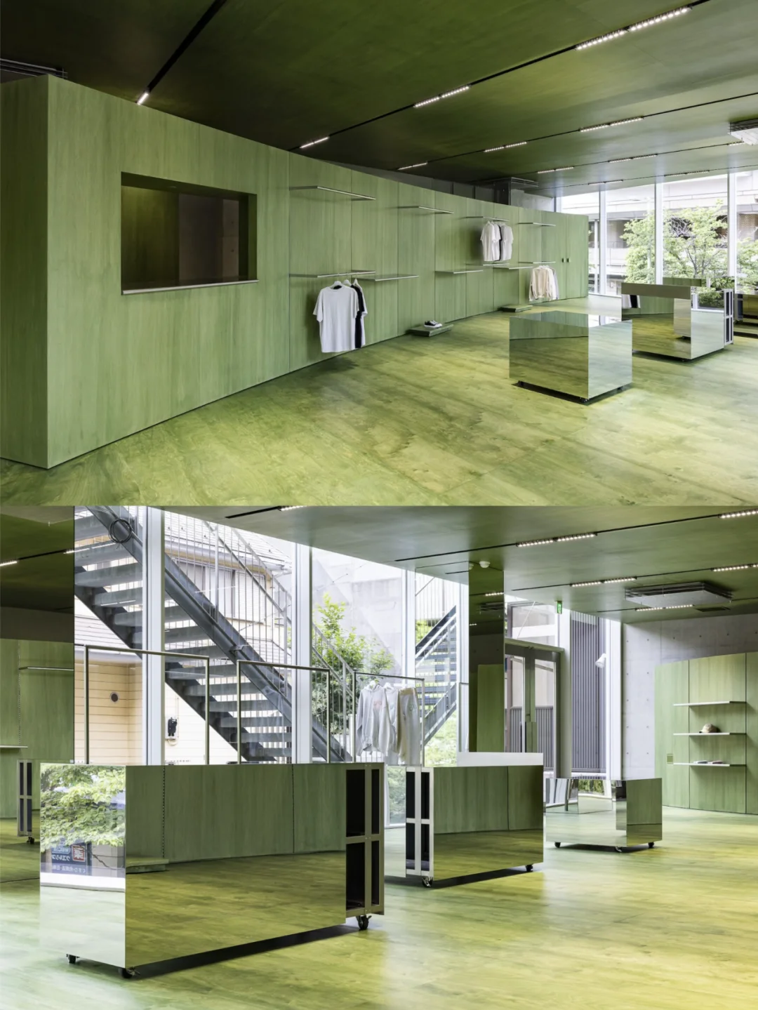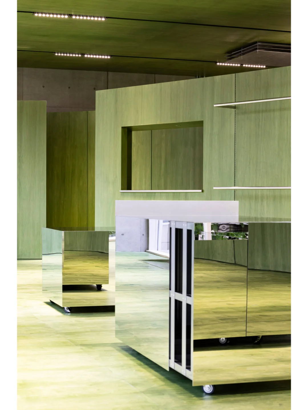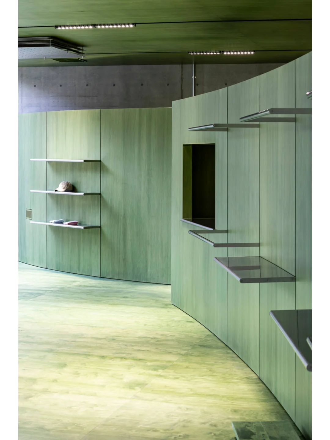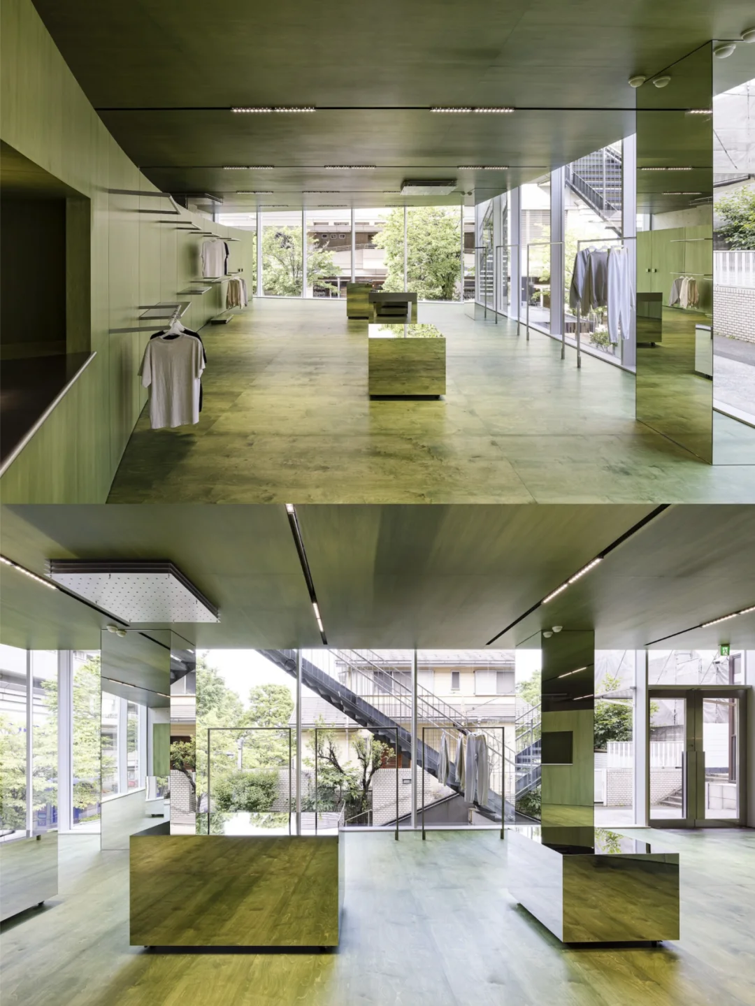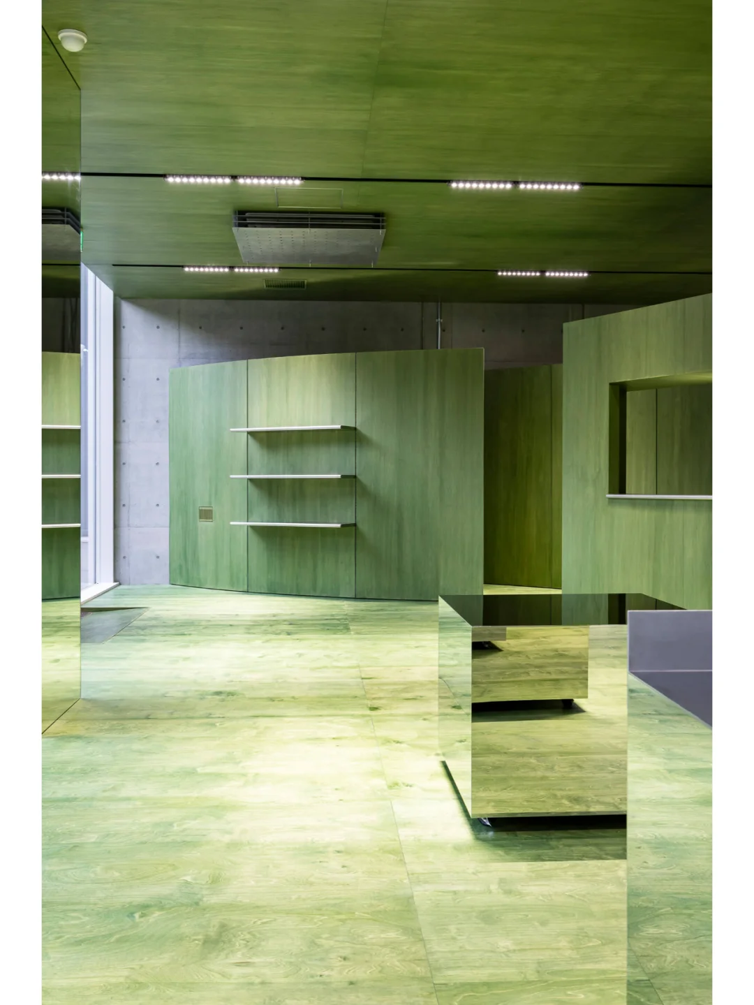 室外通道将顾客引入绿色街道的怀抱,店内设计延续这一理念,大窗引入自然光景,营造树冠环绕之感。绿色主色调贯穿地板、墙面与天花板,模糊内外界限。产品展示墙弯曲呼应自然形态,反光展台中心摆放,加深室内外融合。
