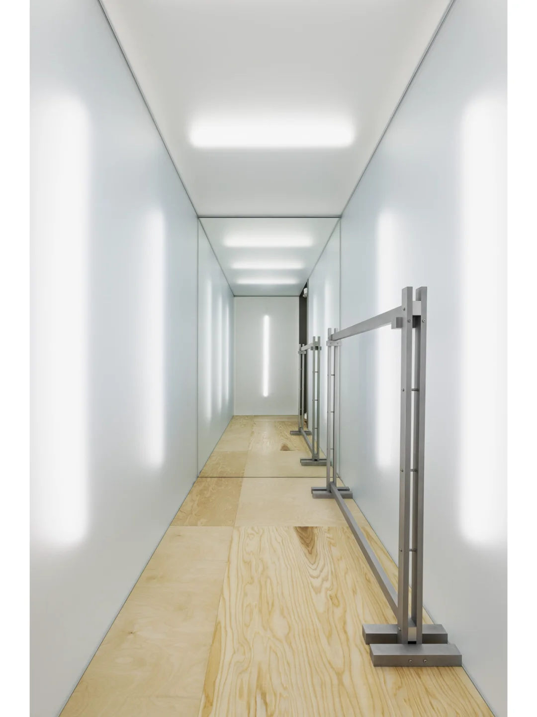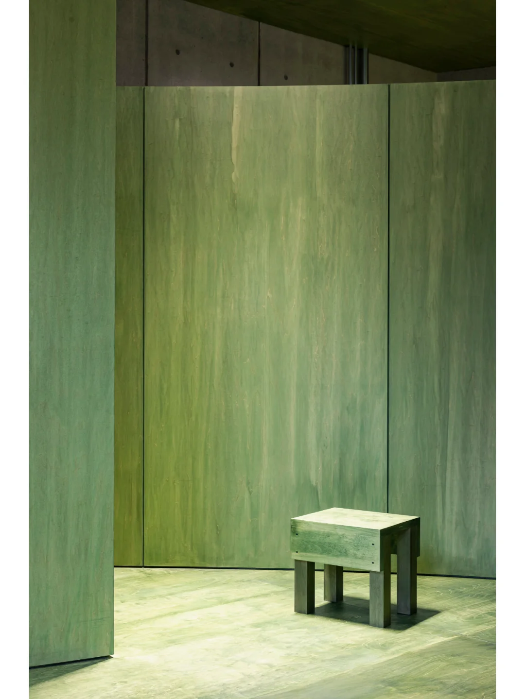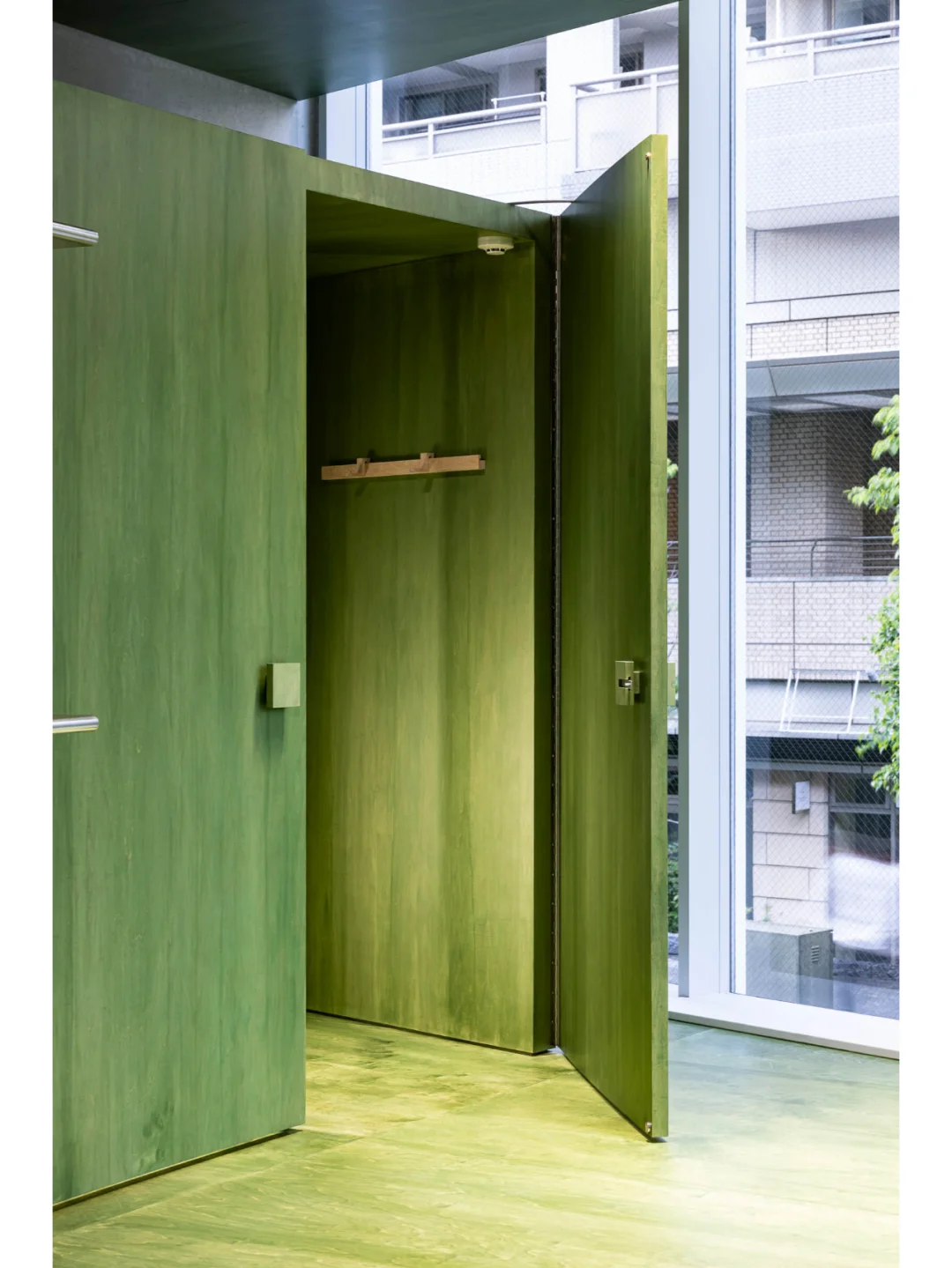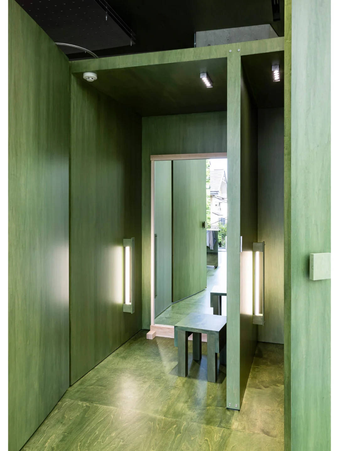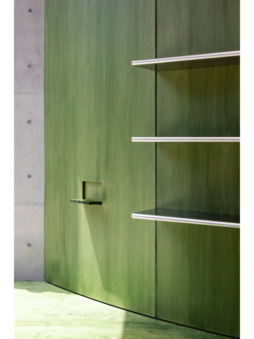 室外通道将顾客引入绿色街道的怀抱,店内设计延续这一理念,大窗引入自然光景,营造树冠环绕之感。绿色主色调贯穿地板、墙面与天花板,模糊内外界限。产品展示墙弯曲呼应自然形态,反光展台中心摆放,加深室内外融合。