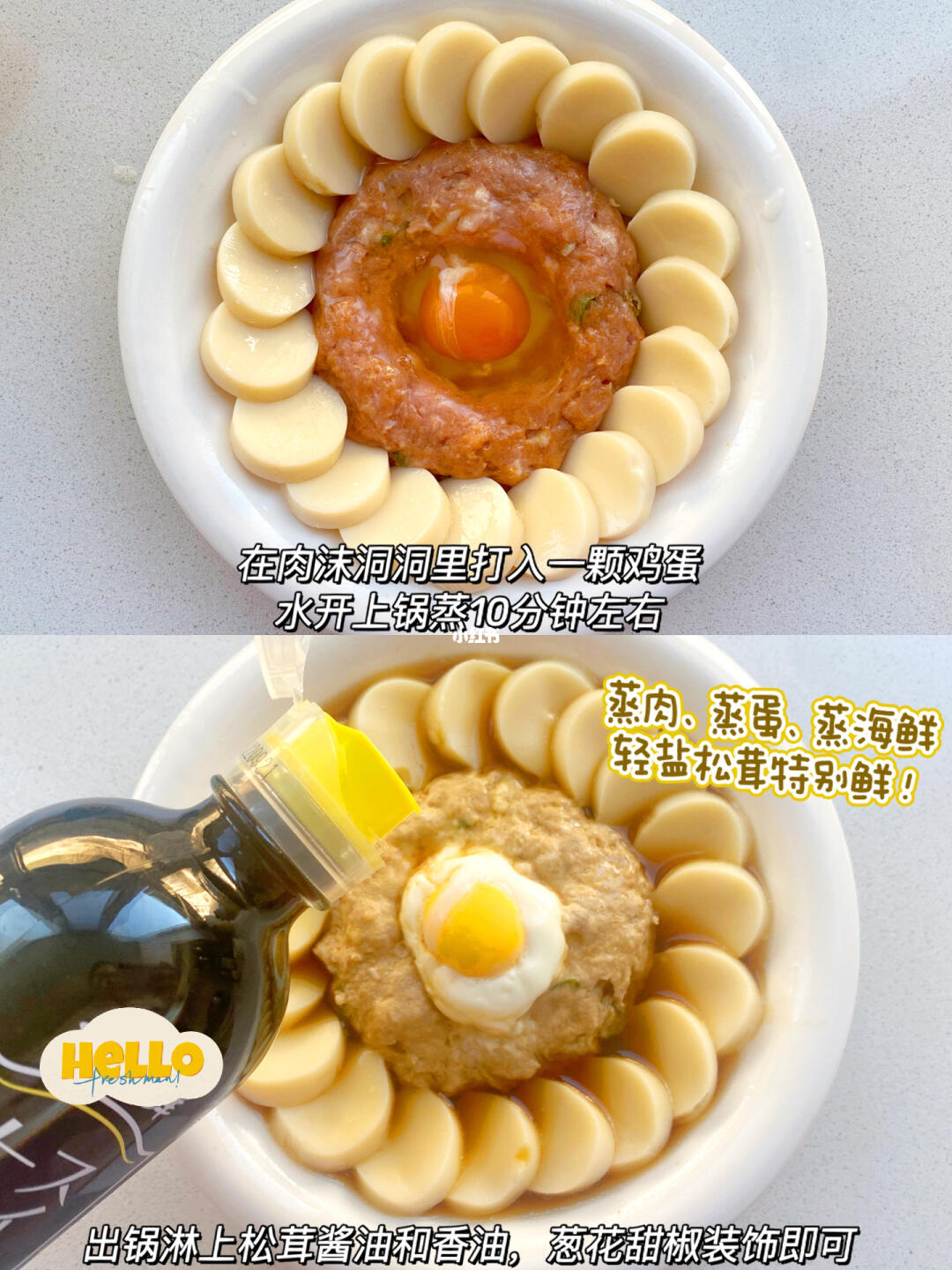2⃣️玉子豆腐切片备用。肉沫摆入盘中,中间留一个洞打入鸡蛋。玉子豆腐摆在外面一圈。