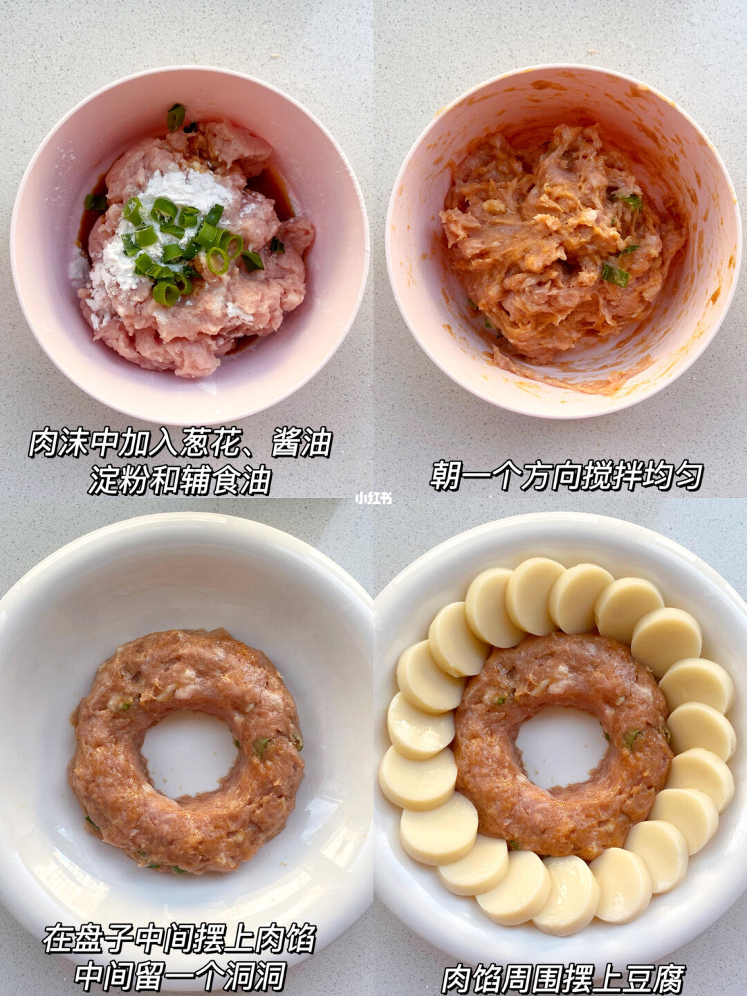 1⃣️肉末加葱花、1勺生抽、半勺淀粉、辅食油搅拌均匀。