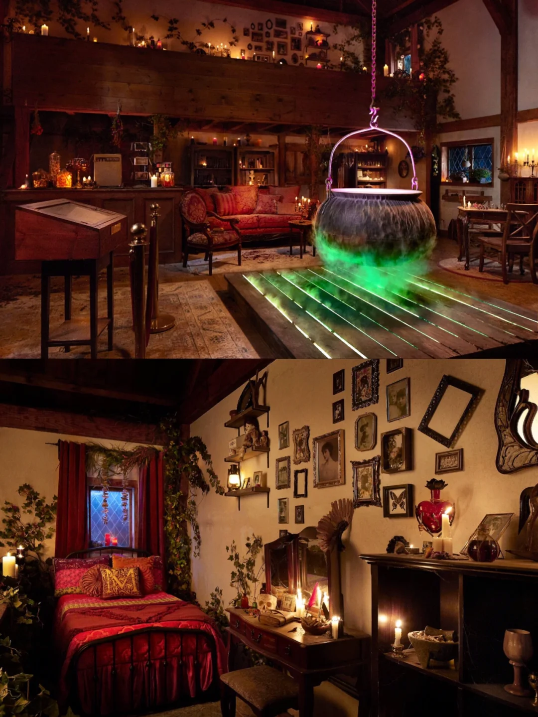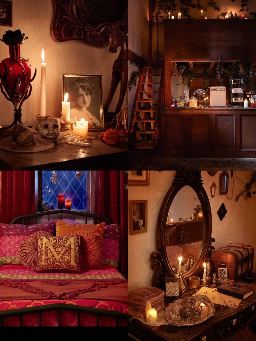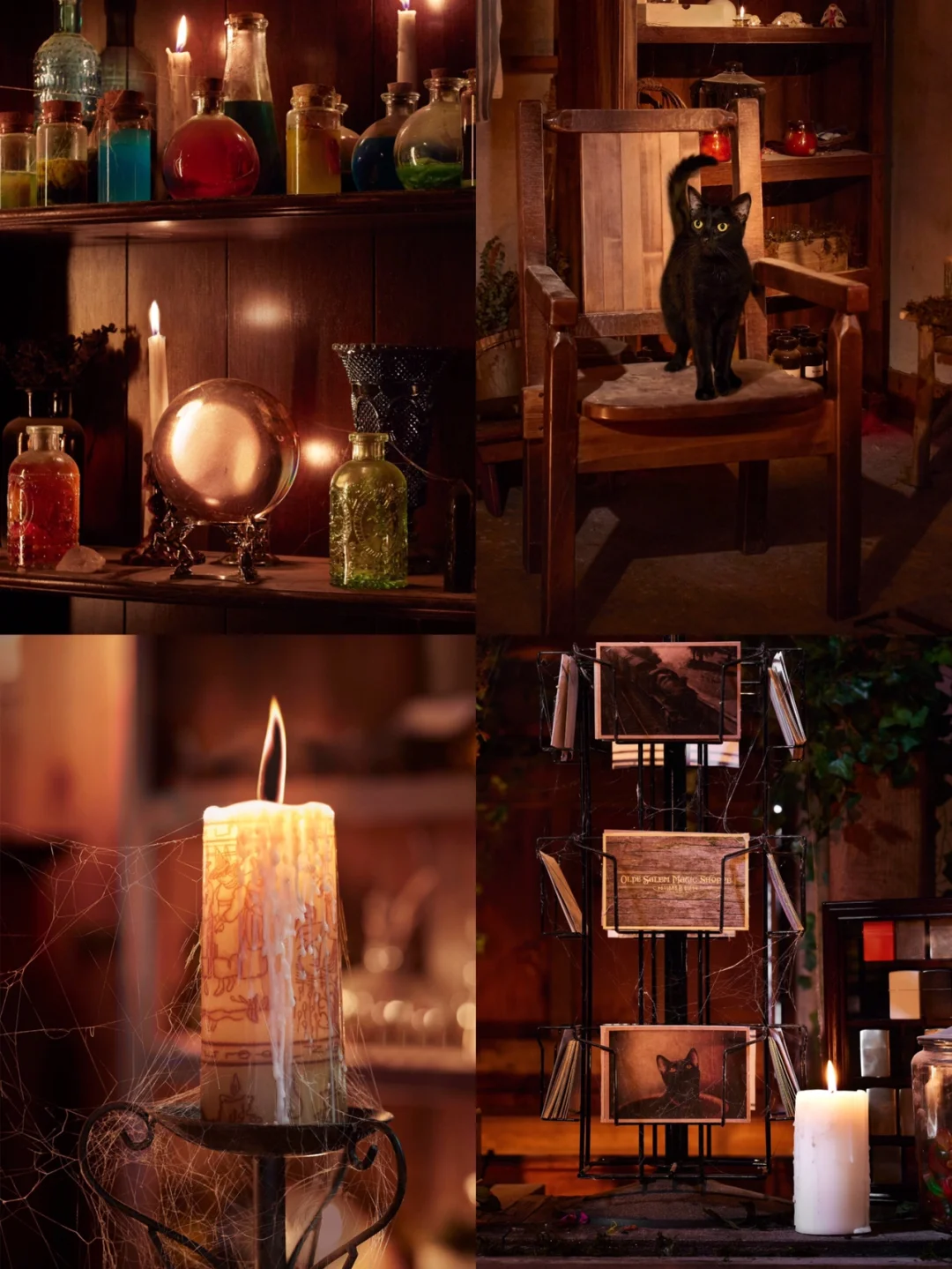 🔹屋内的装修简直细节满满,有女巫扫帚和五颜六色的药剂,有魔术手册和冥想手册,黑火蜡烛闪烁,神秘感十足