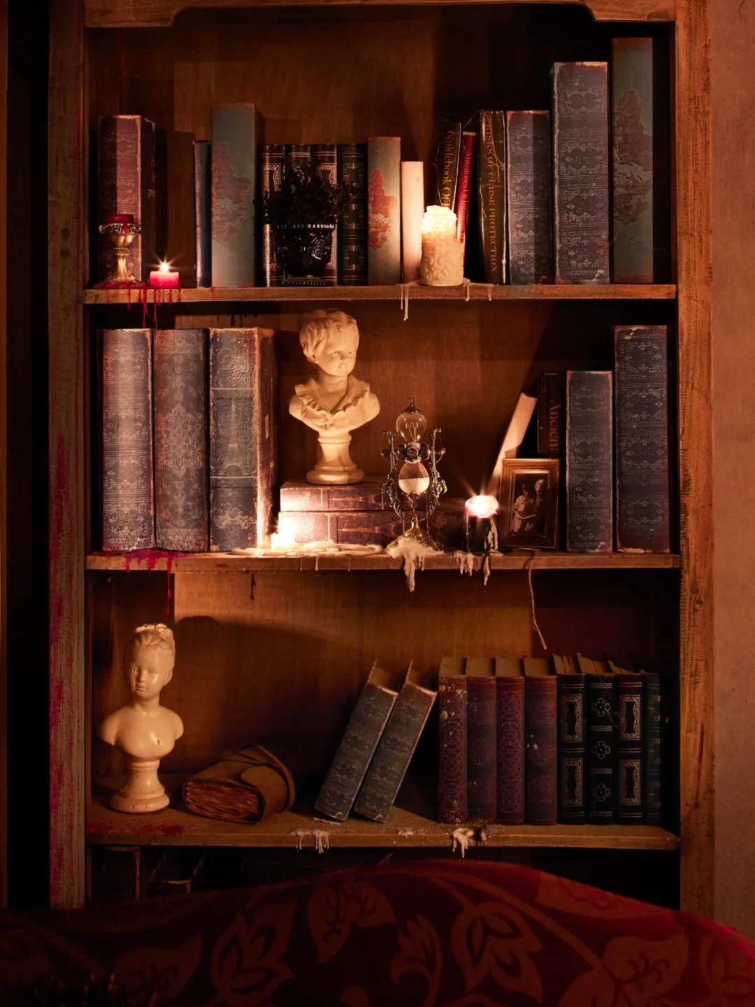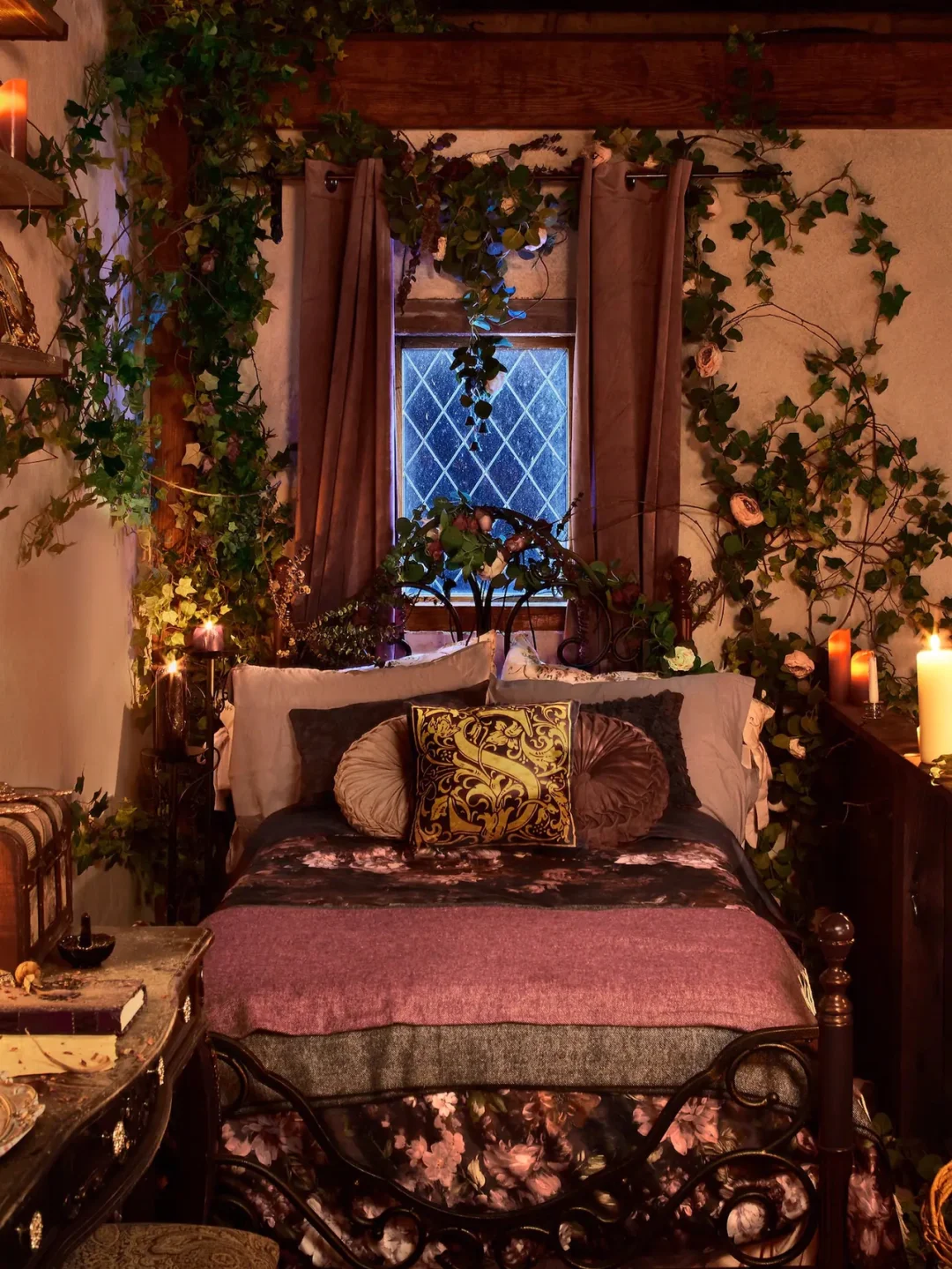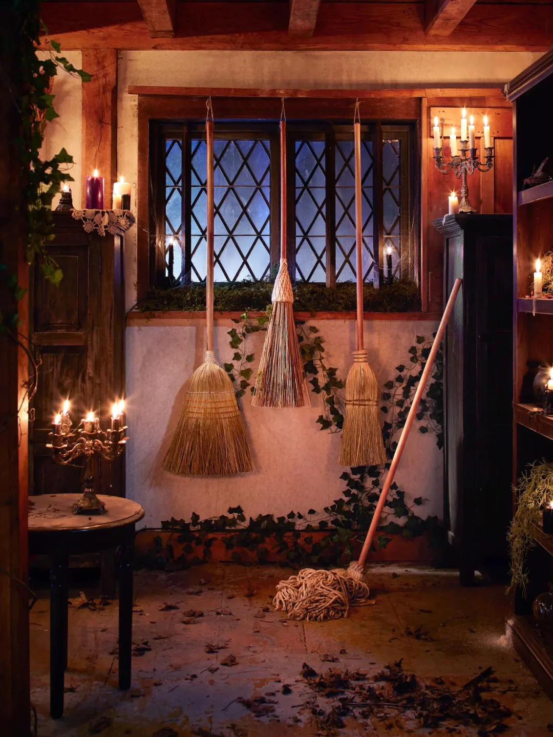 🔹屋内的装修简直细节满满,有女巫扫帚和五颜六色的药剂,有魔术手册和冥想手册,黑火蜡烛闪烁,神秘感十足