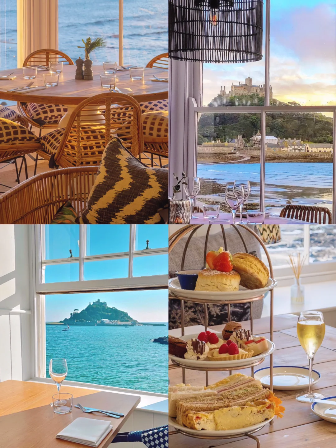 🔹餐厅景观位俯瞰标志性的圣迈克尔山和远处的大海,在潮汐时刻真的非常美,退潮时虽然没有海水了,但依旧可以欣赏圣迈克尔山