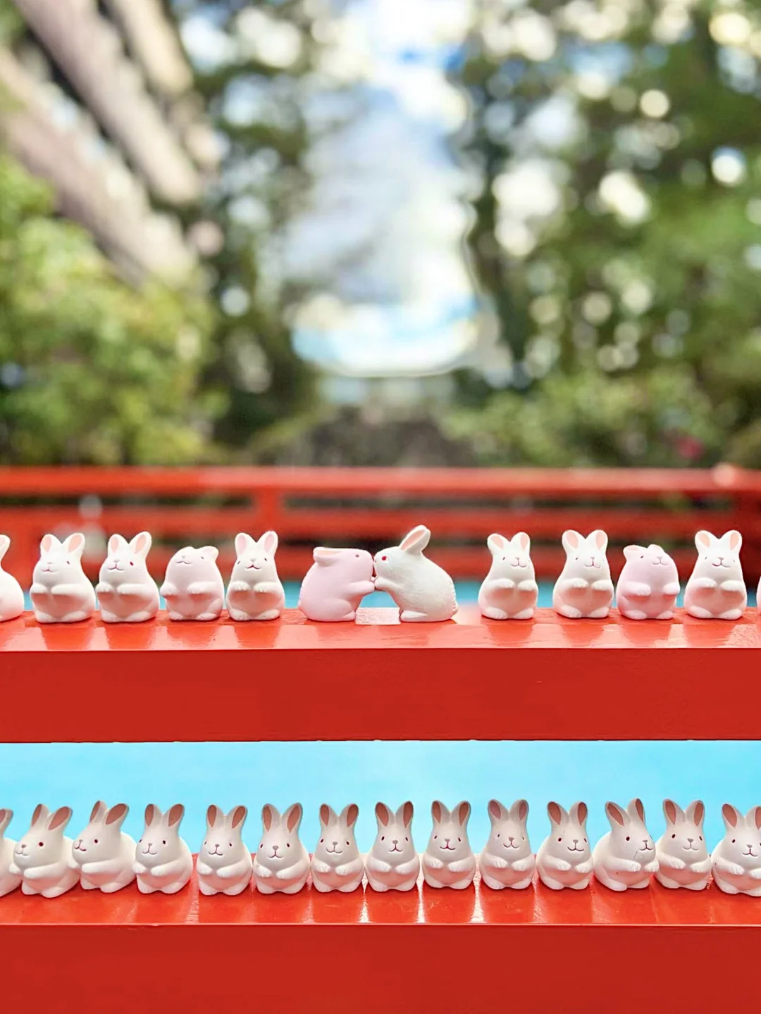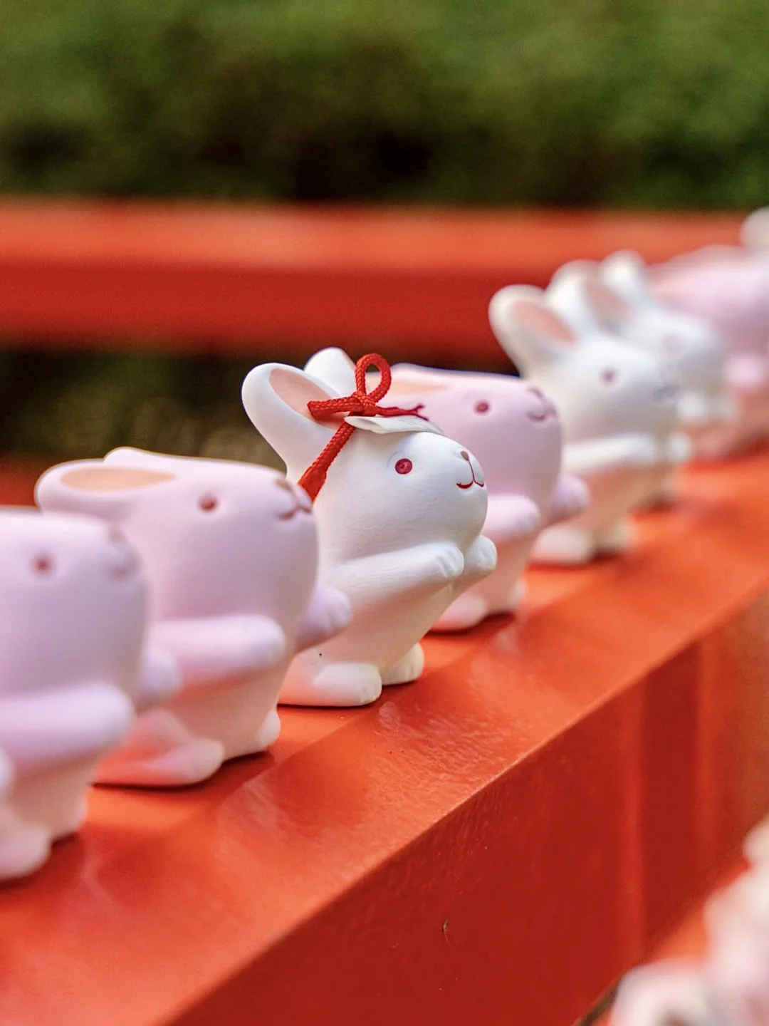 🔹走进神社,可以看到许多并排在一起的兔子,整齐的地排列在柱上柱子上,这也是神社里大家都会去打卡的地方,兔子小巧可爱,非常圆润,让人忍不住带回家