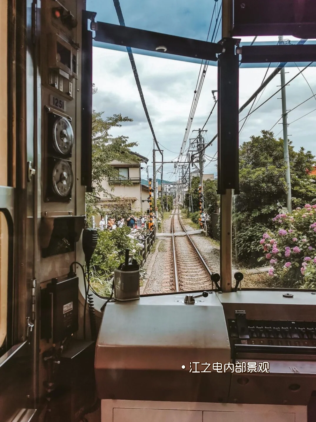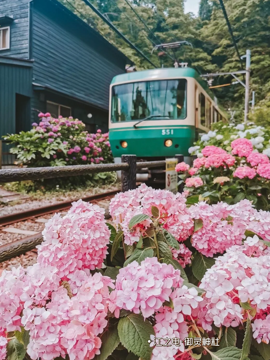门口非常有名的摄影之地,拍照时可以将开满了各种颜色绣球花的“绣球花小道”、沿途的绣球花以及复古的江之电电车收入同一镜头里。