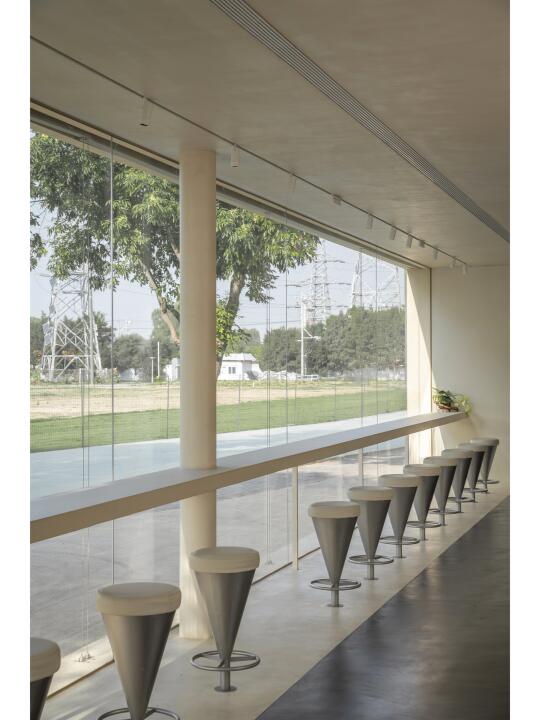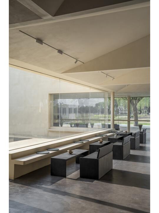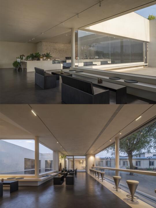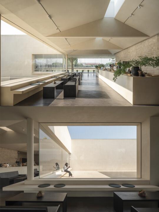 设计团队通过设置水平向的景框,将咖啡厅最大限度地向园区及内部庭院开放,营造出一种看与被看的有趣关系。景框向室内延展,形成了吧台和卡座。
