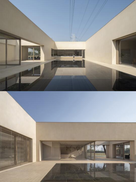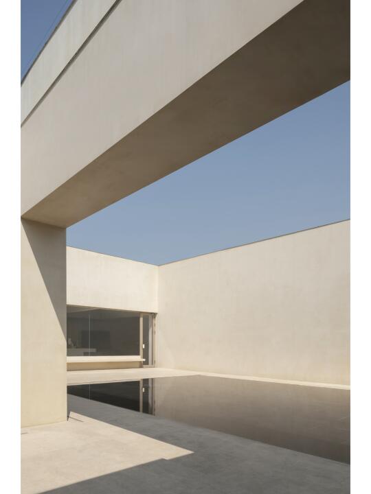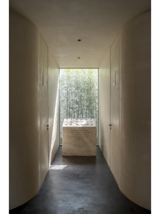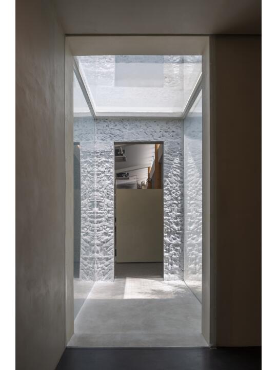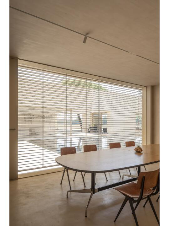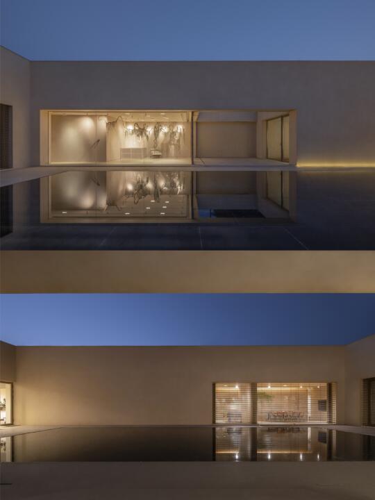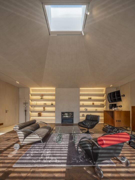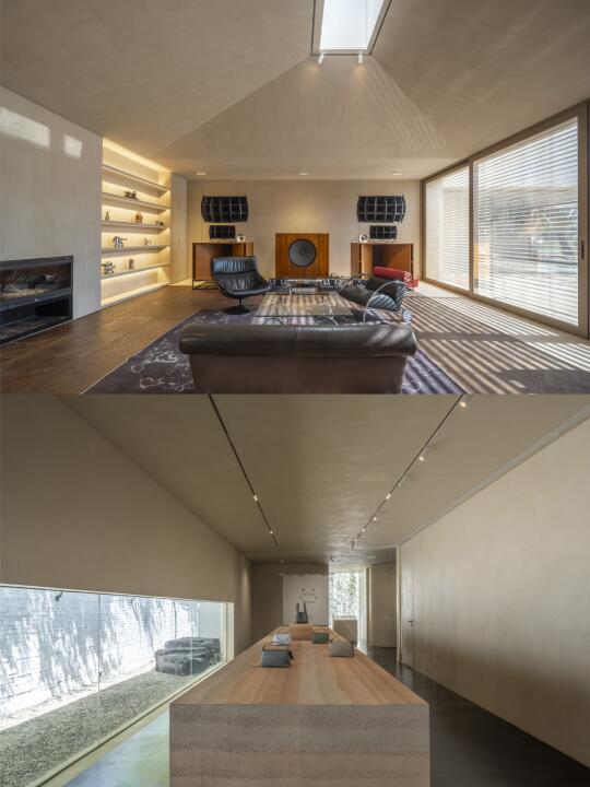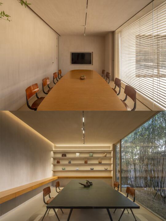 围绕庭院四周的墙面开设不同的景框延展成为功能不同的房间,作为会议室、会客厅、直播间等。