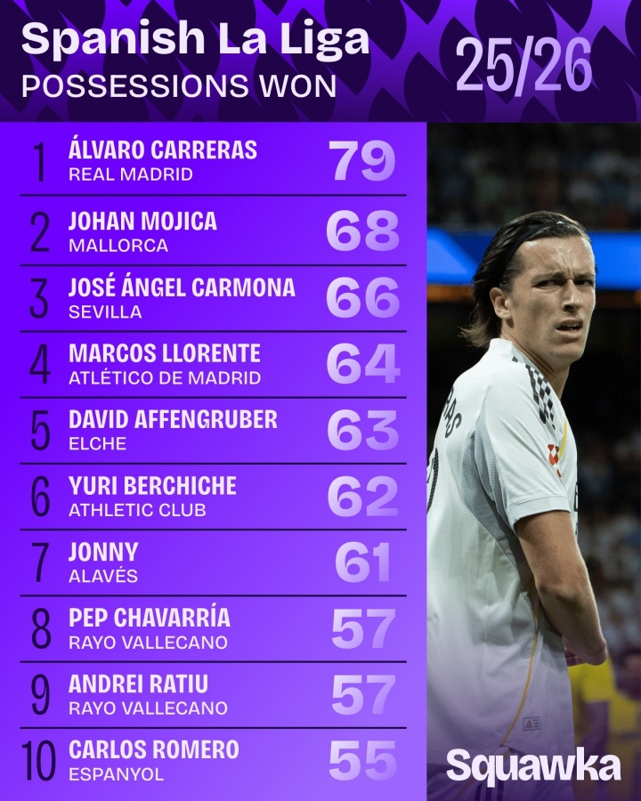 直播吧11月12日讯在球场上,皇马后卫阿尔瓦罗-卡雷拉斯以作风强硬,拼劲十足著称。根据Squawka的数据统计,卡雷拉斯是本赛季西甲夺回球权最多的球员,达到了79次。