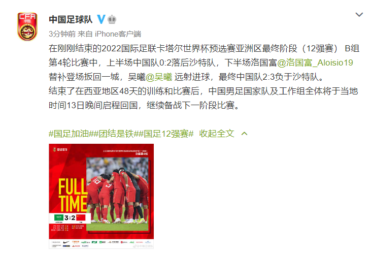 这次回国意味着球队今年最后两场世预赛的备战工作正式开始。在刚刚结束的世预赛亚洲区12强赛中,中国队做客 2-3不敌沙特队,洛国富挑射打进国家队首球,吴曦终场前低射破门难救主。