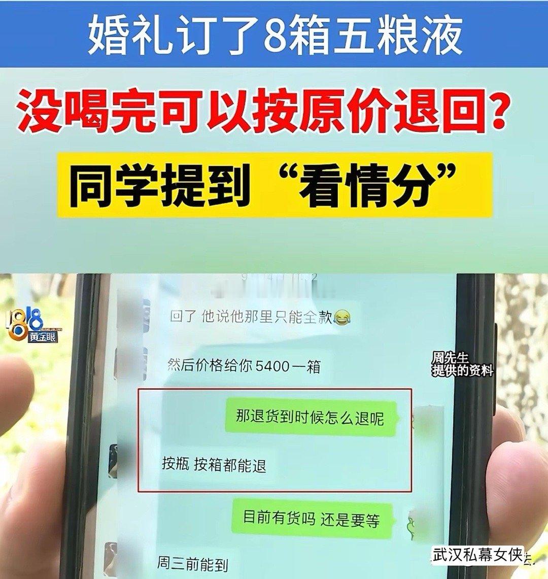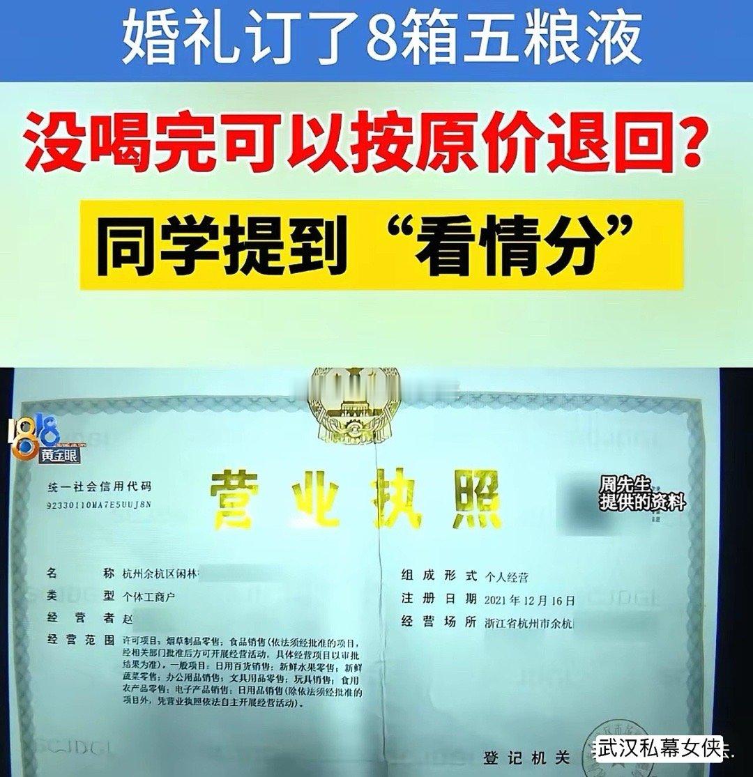 浙江杭州,男子结婚,为了有排场,找老同学买了8箱五粮液,一箱5400元,算下来900元/瓶。老同学还承诺,用不完的还价退。谁知,婚礼结束后,8箱酒竟剩了6箱。他赶紧找到老同学退掉,老同学拖了半个多月,答应给退,但提出让验酒师验过以后才能退,结果验酒师发现有6箱全部猜了箱。老同学不干了,只能按770元/瓶给退。男子翻脸了,找来媒体曝光此事,并要求查看营业执照。周先生要结婚,烟酒是刚需,既要撑得起场面,又得划算实惠,毕竟结婚处处都要花钱,能省则省。周先生正愁着在哪儿买酒靠谱的时候,通过朋友打听得知,自己的高中同学郑老板现在在做卖酒生意,价格听着挺实在。都是老同学,知根知底的,赶紧主动联系上了郑老板。郑老板业是个爽快人,得知老同学办婚礼,要用五粮液,直接给了亲情价,5400块钱一箱,一箱里面装6瓶,这么一算下来,一瓶五粮液正好900元钱。同时,郑老板还承诺,婚礼结束后,若酒没喝完,剩下的可以按原价退回。周先生一听,就没犹豫,当即买了8箱。很快,婚礼热热闹闹地办完了,可等周先生清点剩下的酒时,自己都有点意外,8箱五粮液,竟然只喝了2箱,还剩下整整6箱!周先生赶紧联系郑老板,说要退掉剩余的6箱。郑老板当时也没直接拒绝,只是说快临近国庆了,库房那边得走流程报备一下,让周先生先等等,周先生没多想,就答应了。可这一等,就是半个多月,眼看着国庆都过了,郑老板那边还是没动静,周先生坐不住了。10月15号左右,他主动给郑老板打了电话,没想到,郑老板告知不能按照900块钱一瓶退了。周先生不干了,明明之前承诺,没喝完按原价退,怎么就变卦了?可郑老板那边坚持说不能按原价退。之后,周先生又跟郑老板陆续谈了好几次,可迟迟没谈拢。10月17号,周先生又主动在微信上问起酒的事情,过了一天,郑老板给出了一个方案,称五粮液的回收价大概在800块钱左右,让周先生自己找个地方回收,承诺每瓶补80块钱,就当没挣钱,帮他个忙。周先生不能接受,认为郑老板出尔反尔,不讲信用。气愤之下,决定寻求媒体的帮助,替自己讨要说法。直到采访前一天,郑老板提出安排一位验酒师到周先生家里验酒,称只要酒没问题,就按原价退。可验酒师一到周先生家,打开那6箱酒一看,竟发现这6箱酒的外包装胶条,都被撕开过!验酒师当场就跟郑老板反馈了情况,说这酒不能按照原箱的价格退,只能按单瓶的价格来退。这下子,周先生不乐意了,他跟郑老板说,虽然外包装胶条开了,但酒本身一点问题都没有,不影响品质,坚决要求按900一瓶退。最终,双方还是没谈妥。记者了解到情况后,联系上了郑老板,郑老板委屈的说,当初答应原价退,纯粹是看在同学情分上,而且那时候不知道箱子被拆过的情况,现在原箱被拆了,肯定不能按原价退。郑老板还说,他最生气的不是箱子被拆了,而是周先生耍小心机:验酒师一眼就看出来了,他是把酒拿出来之后又放回箱子里,还重新封了胶条!这要是验酒师没看清楚,他这些酒拿出去卖,被人发现是后封的,到时候自己不仅卖不出去,还得砸了自己的生意口碑,这不是坑人呢吗?郑老板还说,在验酒之前,周先生跟他说有两箱酒是没拆封的,当时两人已经谈好了,那两箱按770元一瓶退,剩下的按单瓶750元一瓶退。可验酒师发现所有箱子都被拆过之后,他就提出统一按750元一瓶回收,可周先生当场就没答应,还因为这一瓶20块钱的差价,把验酒师给赶走了,最后验酒师的来回路费,还是郑老板自己掏的腰包。周先生这边向记者出示了之前两人的聊天记录,记录上周先生问郑老板退货怎么退?郑老板在微信上明确回复“按瓶、按箱都能退”,双方却没提到退货条件。最后,在记者的调解下,郑老板愿意全部按770元一瓶回收,可周先生还是不能接受。他表示会走法律程序,还对郑先生是否是合法经营提出质疑。郑老板一气之下,把一本个体工商营业执照发给了过来,但上面显示经营者姓赵,郑老板说那是他表姐,自己是帮表姐打理生意,经营资质是齐全的,不怕周先生搞事情。根据《消费者权益保护法》第24条规定,经营者提供的商品或者服务不符合质量要求的,消费者可以依照国家规定、当事人约定退货,或者要求经营者履行更换、修理等义务。没有国家规定和当事人约定的,消费者可以自收到商品之日起七日内退货;七日后符合法定解除合同条件的,消费者可以及时退货,不符合法定解除合同条件的,可以要求经营者履行更换、修理等义务。虽然郑老板以酒的外包装胶条被撕开,影响二次销售为由,拒绝按原价退货,但双方在约定退货时并未明确提及包装完整性的问题。且酒本身质量并无问题,因此,郑老板以包装拆封为由降低退货价格缺乏法律依据。