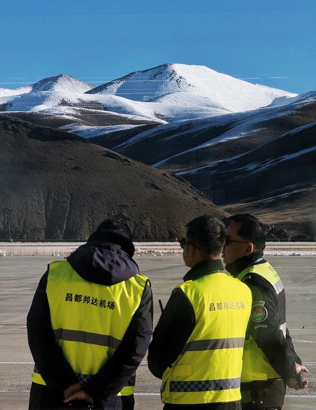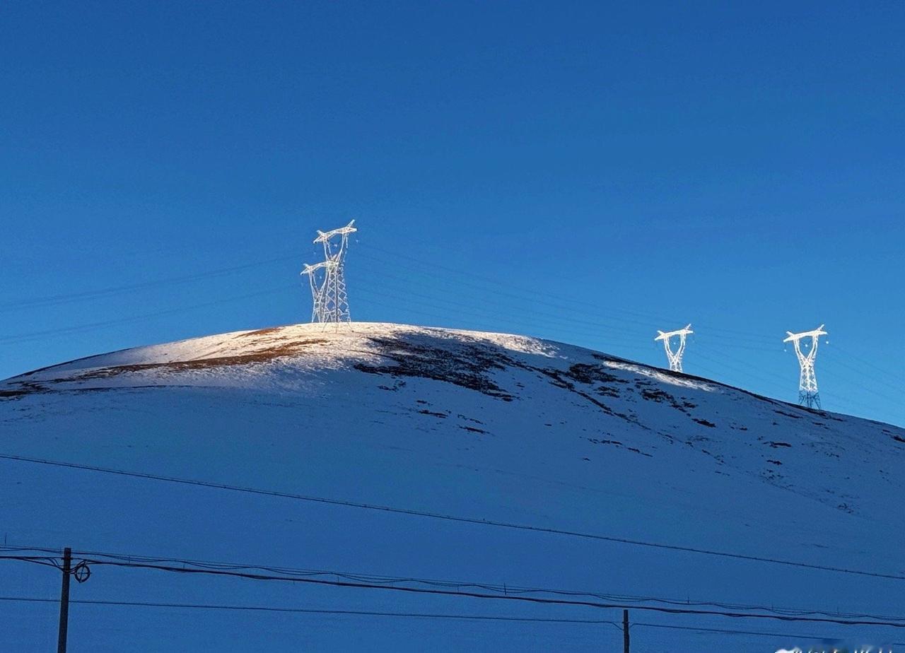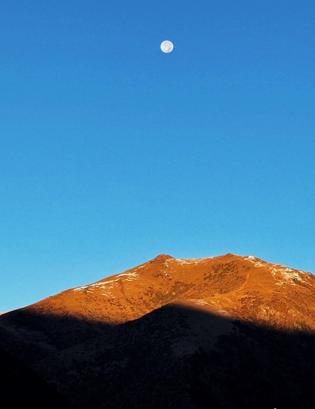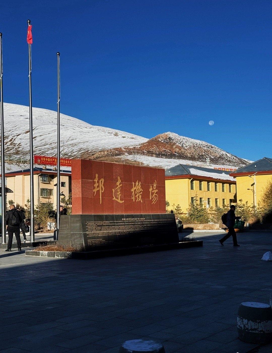 从昌都出发到邦达机场, 会看到月亮像个印章一样挂在天上, 而东边的阳光又撒满了整个山峰。 会路过白雪皑皑的邦达草原, 排排坐的电塔形成了一条奇特的天路。 海拔一路上升, 从3200多米到4300多米, 最后回到300米。