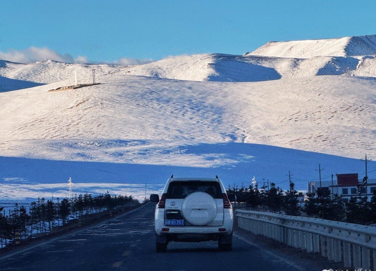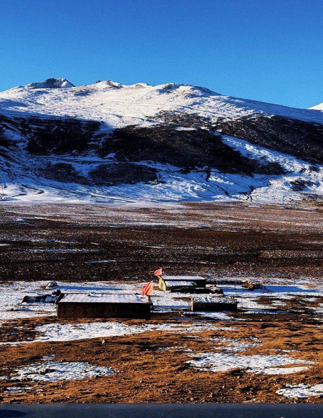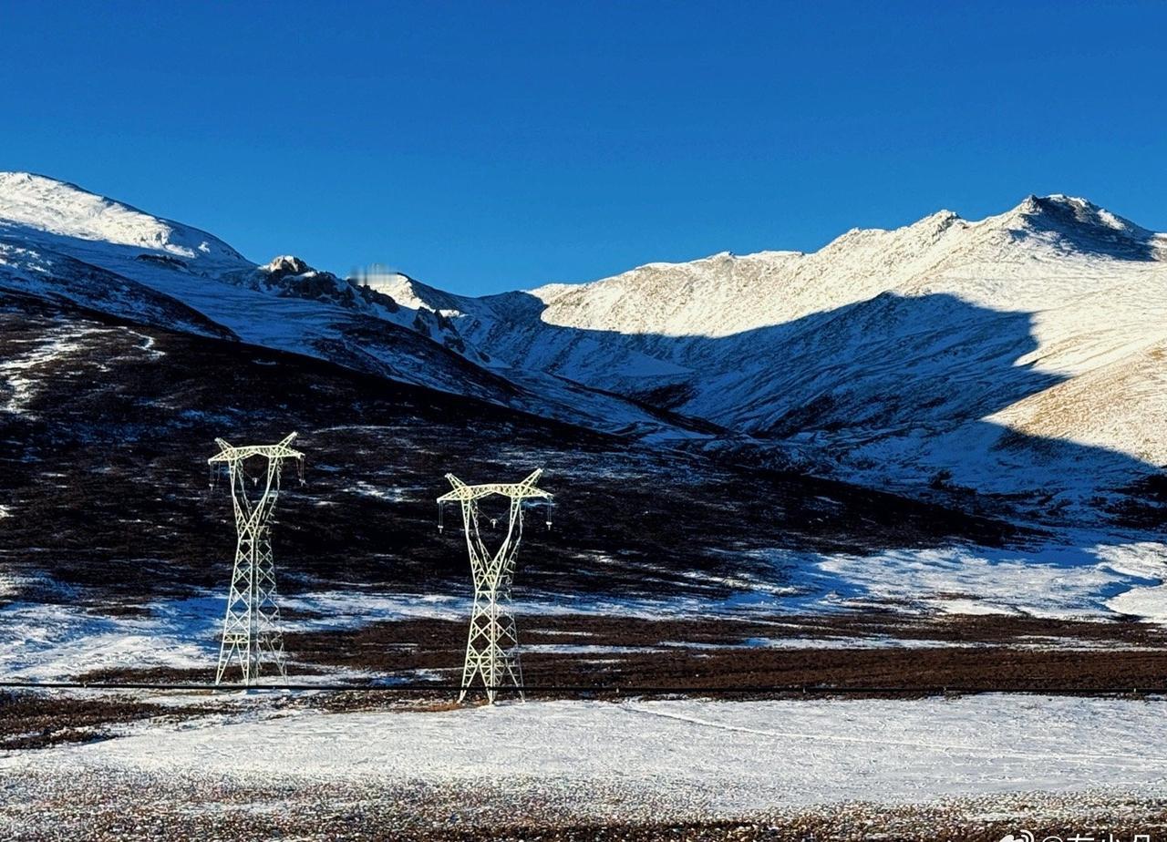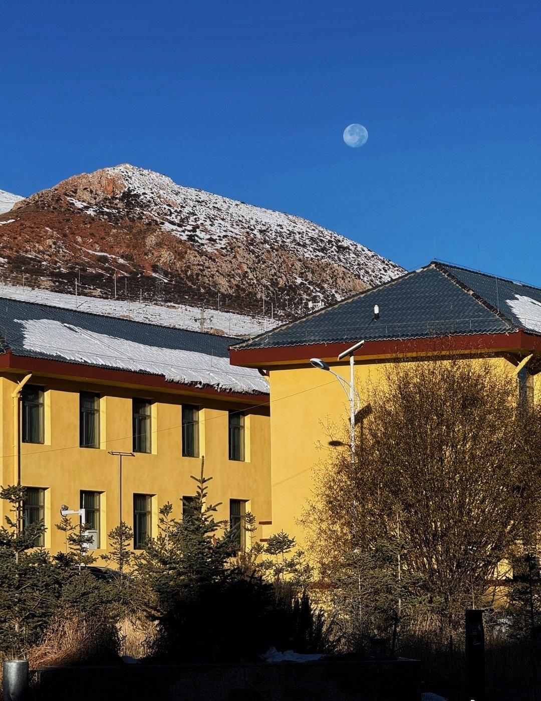 从昌都出发到邦达机场, 会看到月亮像个印章一样挂在天上, 而东边的阳光又撒满了整个山峰。 会路过白雪皑皑的邦达草原, 排排坐的电塔形成了一条奇特的天路。 海拔一路上升, 从3200多米到4300多米, 最后回到300米。